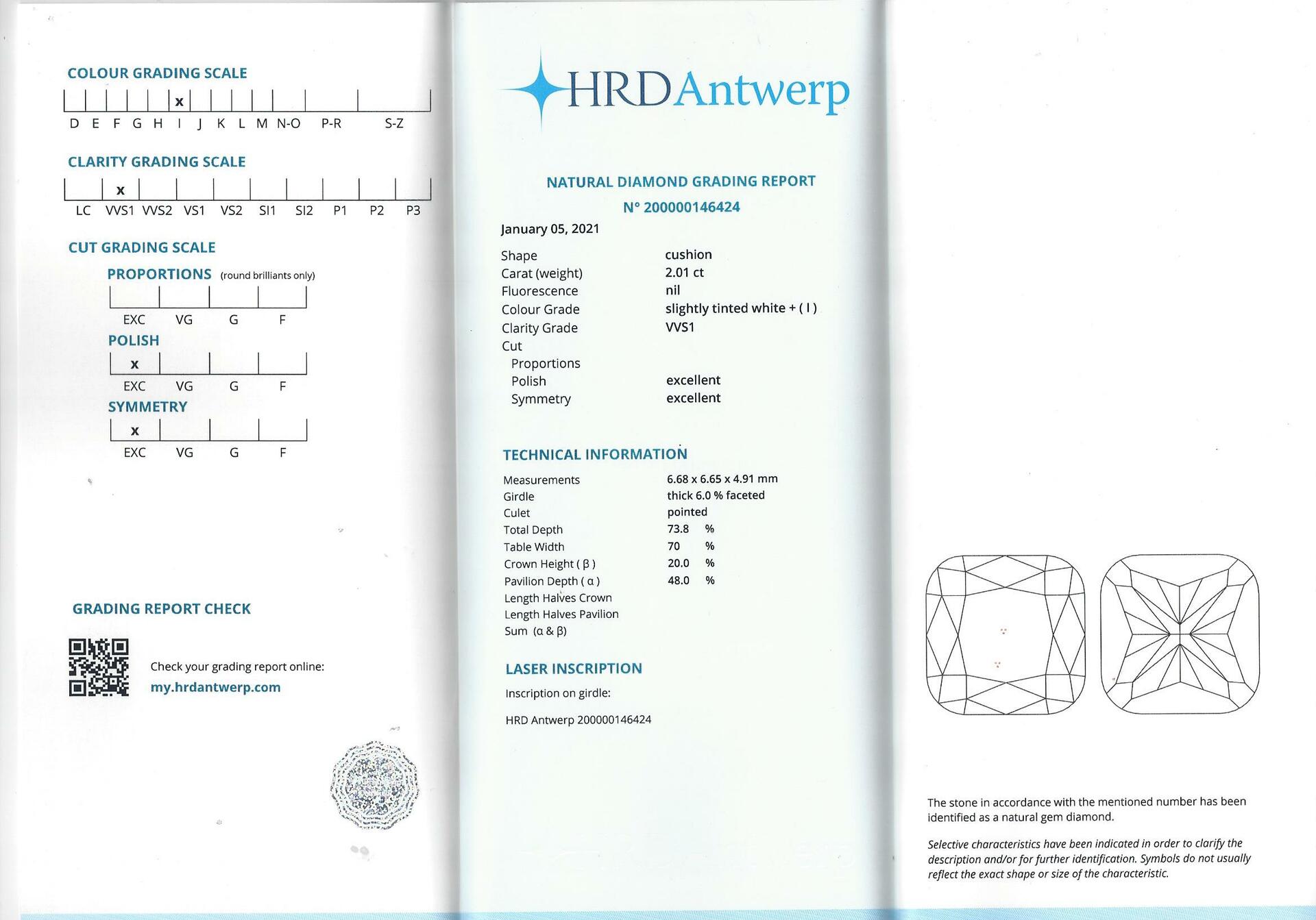 - HRD certified 2.01ct center diamond with a truly gorgeous square cushion cut