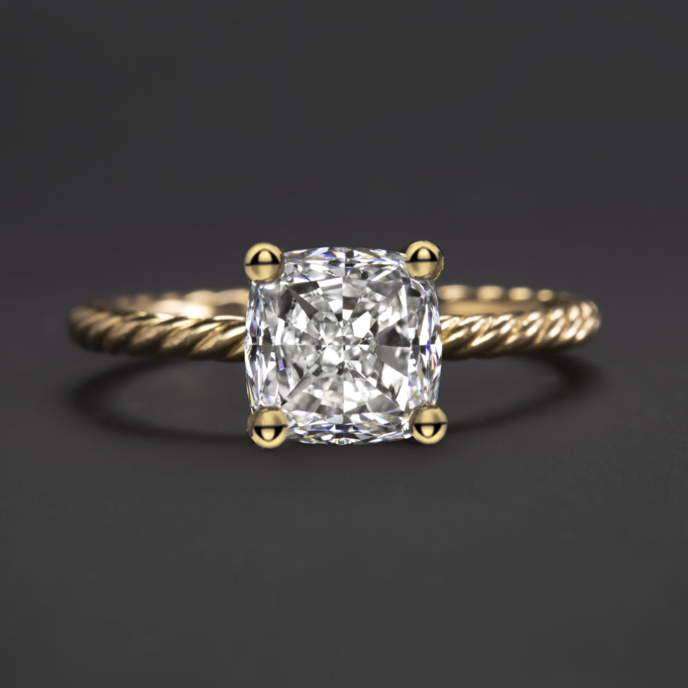 Classic with a twist, this diamond solitaire showcases a substantial and high quality 2.01ct cushion cut diamond in rich 18k rose gold. The setting is an authentic David Yurman and bears the David Yurman hallmark. It is an excellent choice for an engagement ring that will stay forever in style.
