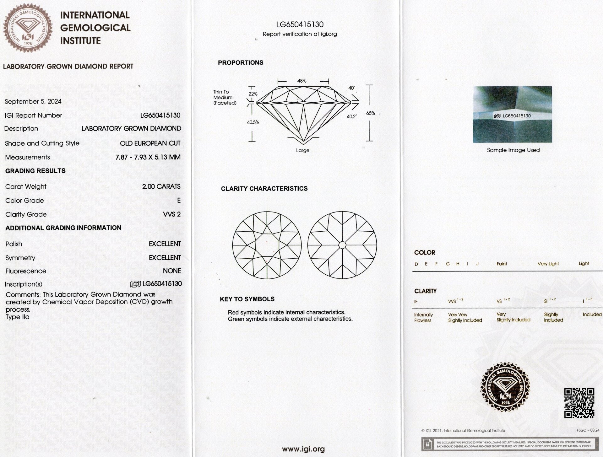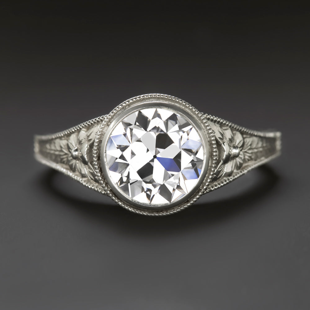 This vintage inspired lab grown diamond ring features a 2 carat old European cut lab grown diamond paired with a romantic, vintage style solitaire setting.