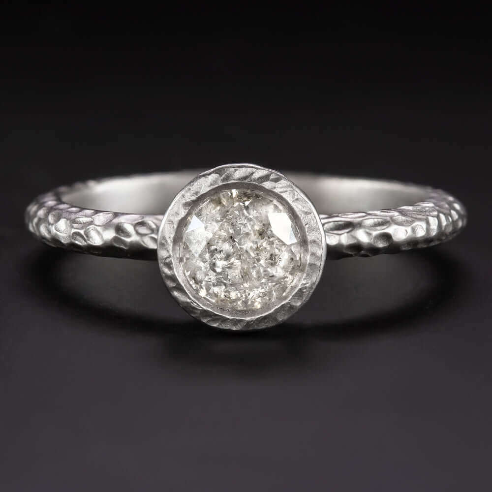 The diamond is completely natural earth mined and has not received any treatments or enhancements. The 0.75ct round brilliant cut diamond was carefully selected from a set of beautifully varied natural diamonds to create an aesthetic, harmonious look that works perfectly with the setting. The diamond is beautifully unique with pleasant, white inclusions. The diamond’s round brilliant cut displays lovely sparkle. The effect is a gorgeous marrying of the sparkle of this traditional cut with the organic beauty of the rustic diamond. The unique diamond along with the matte hammer finish on the 14k white gold setting, gives this ring an air of rustic and bohemian charm. The ring measures 7.7mm across (north south) and 4.5mm from finger to top.