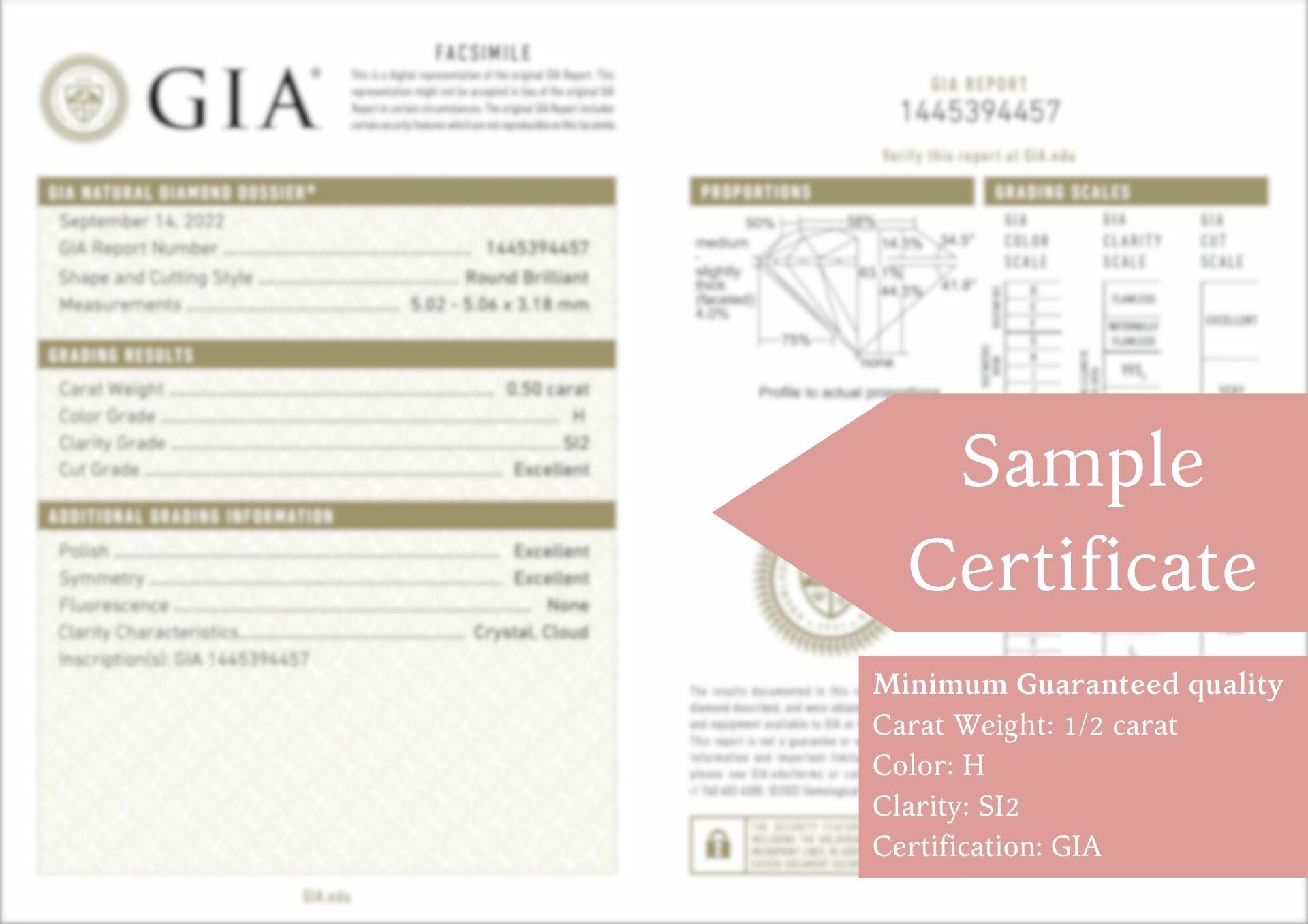 This ring is made to order with our current offering for ½ carat round cut diamonds in this quality. The stone you receive will be the listed quality or better on all stats (color, clarity, cut). Please contact us if you would like to see a certification for our current selection.