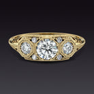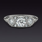 This charming three stone engagement ring features a fantastically brilliant round cut diamond center paired with a beautifully detailed vintage style setting.