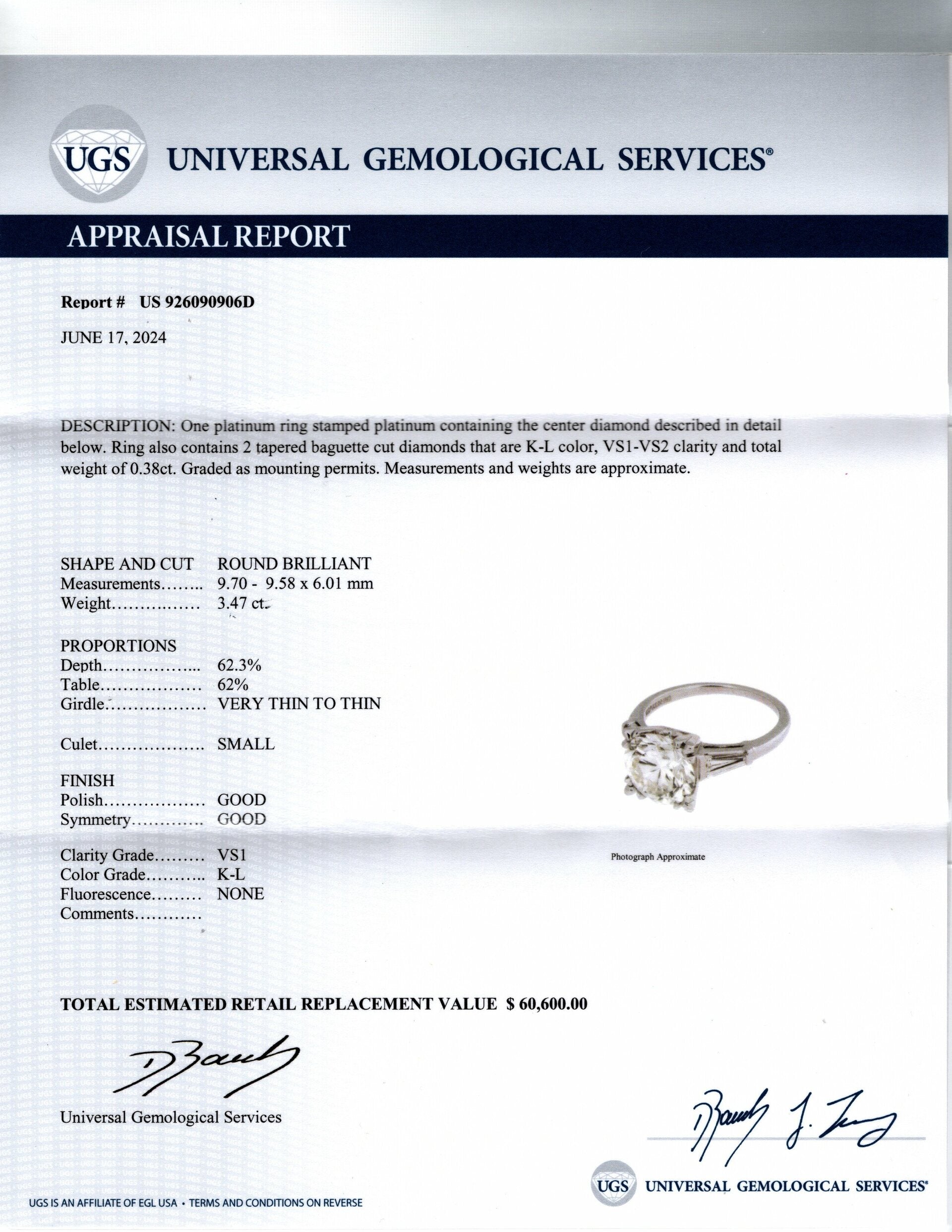 3.5ct CERTIFIED DIAMOND ENGAGEMENT RING K-L VS1 PLATINUM ROUND BAGUETTE 3 STONE