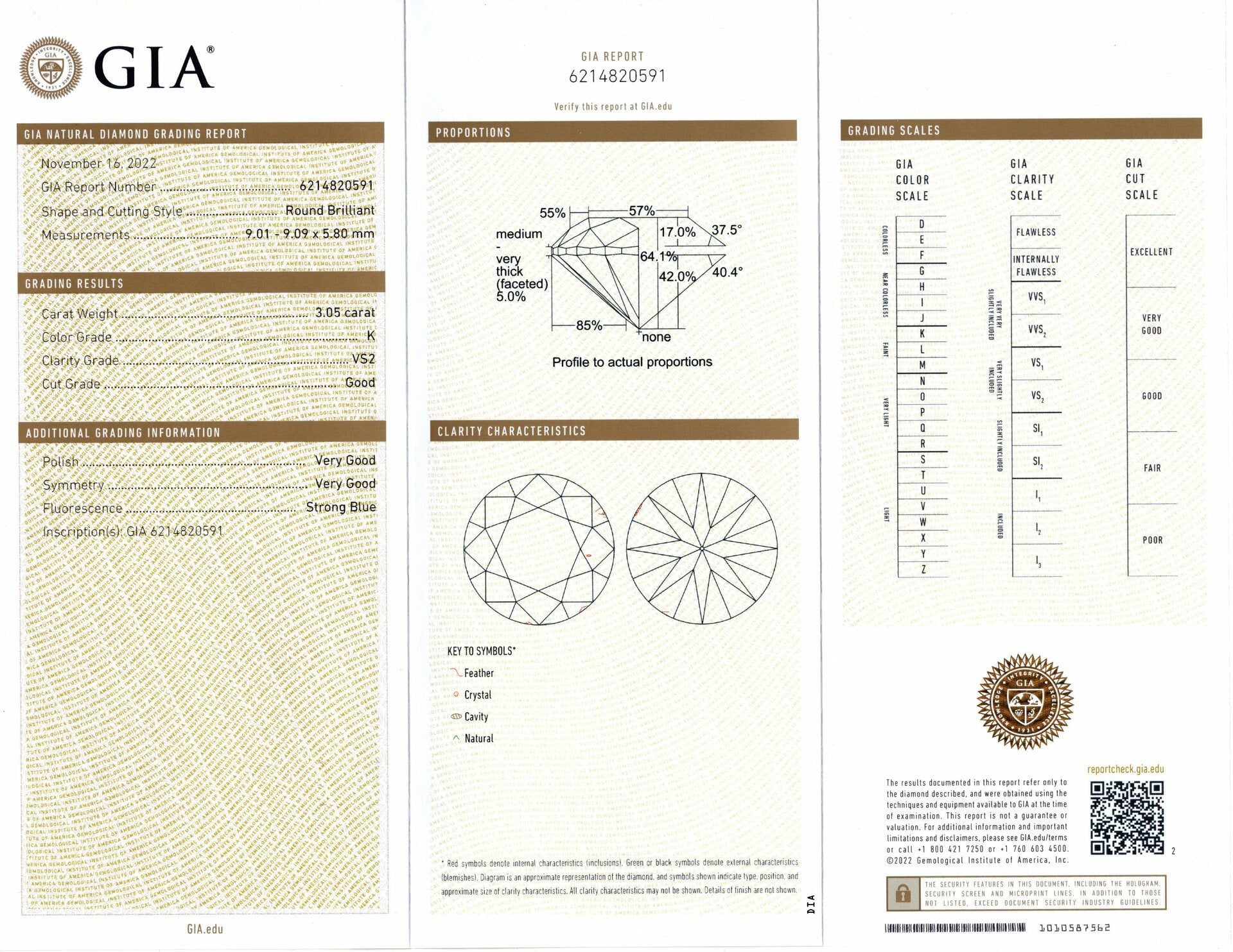 3 CARAT DIAMOND ENGAGEMENT RING PLATINUM GIA CERTIFIED K VS2 ROUND BRILLIANT CUT
