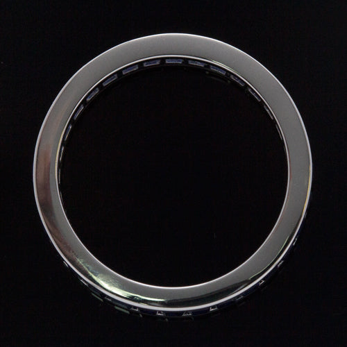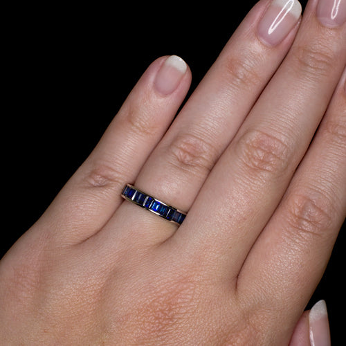 Featured here is a vintage inspired eternity band with 3.18ct of natural sapphires! They are great quality that has a rich, royal blue color that is the color that you dream of when you think of sapphire. It will make a wonderful wedding band or a stackable right hand ring. We carry a variety of other bands with colored gems and diamonds to stack perfectly with this ring! Matching baguette cut sapphires with a perfectly saturated blue hue are securely channel set around the entire band with no gaps between the stones. This was quite a labor intensive piece to craft as each sapphire was cut specifically to fit in this band. These are all Earth-mined stones that have been hand picked and individually custom cut! This is a very labor intensive job and the result is absolutely wonderful. The ring is made from solid 14 karat white gold and each side of the rings gallery has been finished with smooth polish. The ring is solid with openings under the stones for easy cleaning. The band measures 4mm across (north-south) and 2mm from the finger to the top of the band. The ring is a size 6.75 and resizing would require either removing stones or adding a sizing bar by resizing up. Make this gorgeous vintage inspired band with 3.18ct of natural sapphires yours!