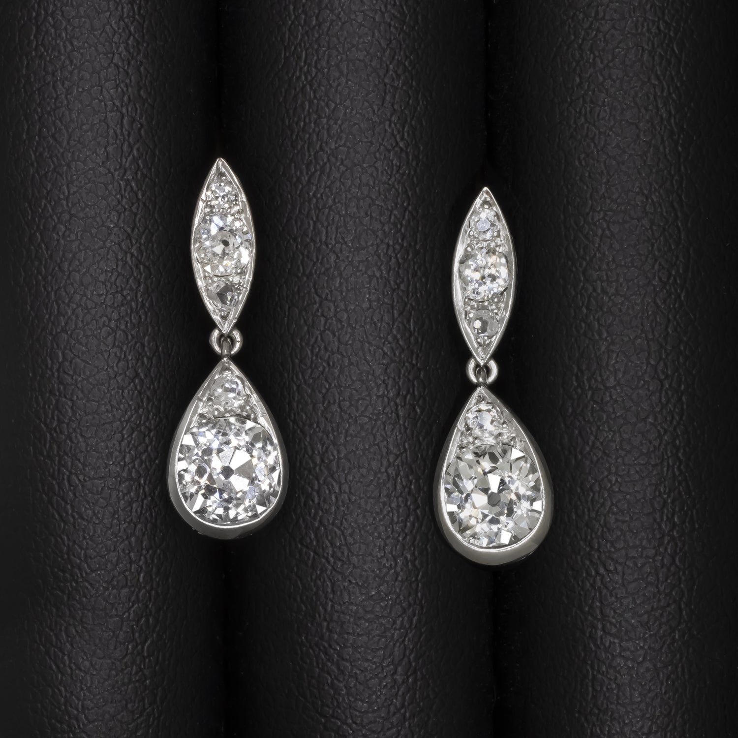 These diamond drop earrings feature a stunning set of old cut diamonds and have an utterly classic look with a sleek finish.