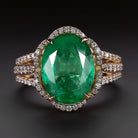 This emerald and diamond cocktail ring features an impressive 4.80ct spring green emerald circled by a glittering halo of diamonds! The split shank and scalloped, floral halo add an elegant, romantic touch.