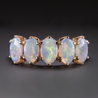 This classic opal cocktail ring features 5 natural opal cabochons set in rich 14k rose gold. Inspired by the opal bands that were popular during the Victorian era!
