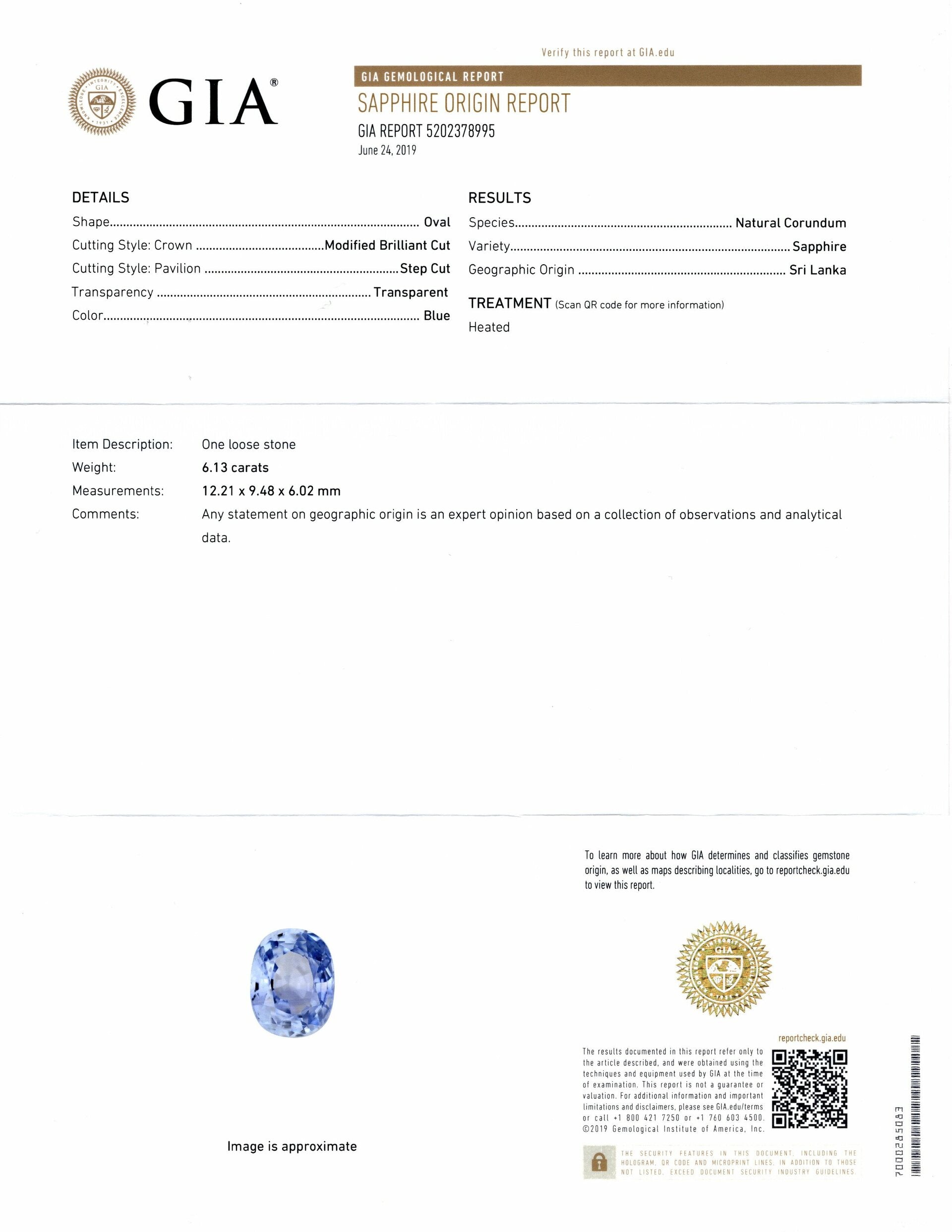 6.13ct CEYLON SAPPHIRE GIA CERTIFIED CORNFLOWER BLUE NATURAL OVAL SHAPE 6 CARAT