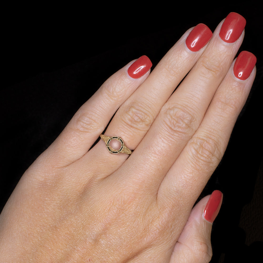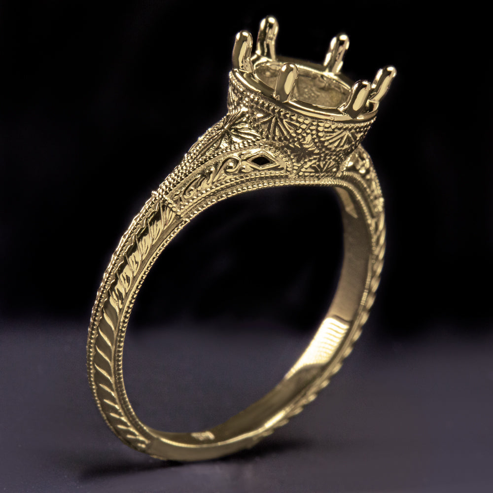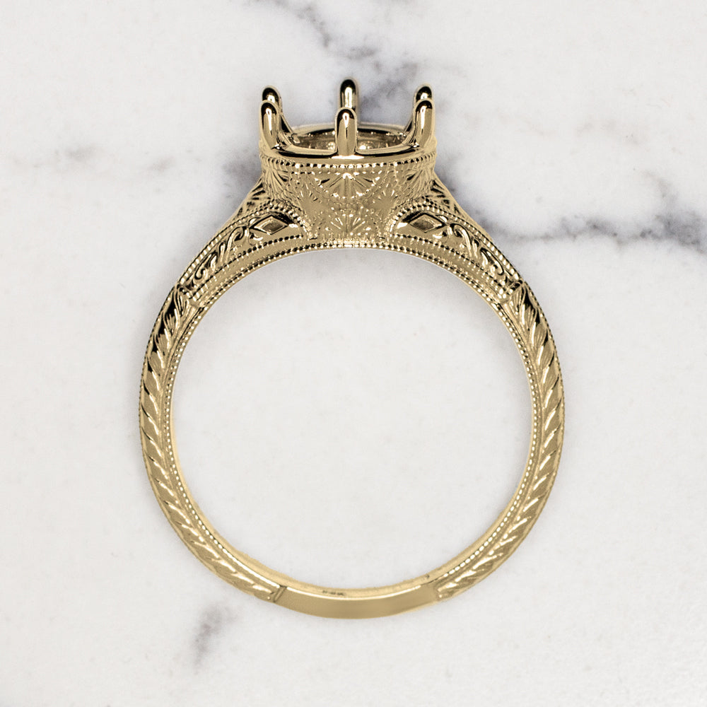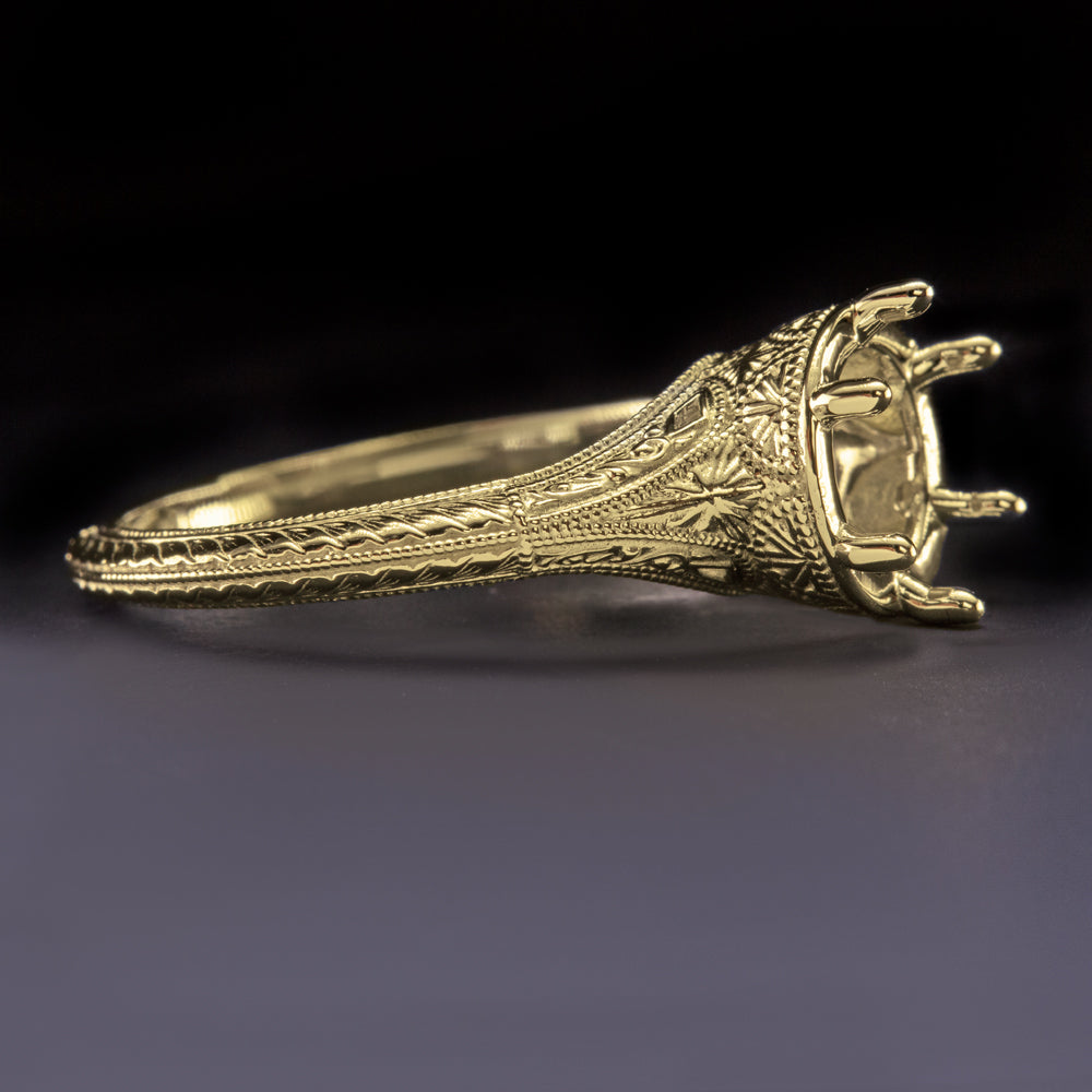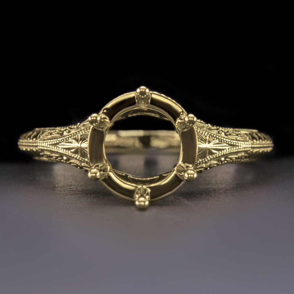This classic vintage inspired 14k yellow gold semi-mount is richly designed with intricate geometric engraving that wraps around the sides of the shank. Romantic and timelessly elegant, this setting provides the perfect backdrop for a diamond or gemstone of your choice. Classically fashionable and sophisticated, this setting beautifully captures the impeccable artistry of antique metalwork and Art Deco design! The setting can fit a round cut center stone with measurements ranging from 7.5-8.0mm in diameter. Please contact us if you are looking for a diamond or gemstone to be set in the center. We can also create a custom version for your existing center stone upon request. The ring measures 9.2mm across (north south) and 7.0mm from finger to top.