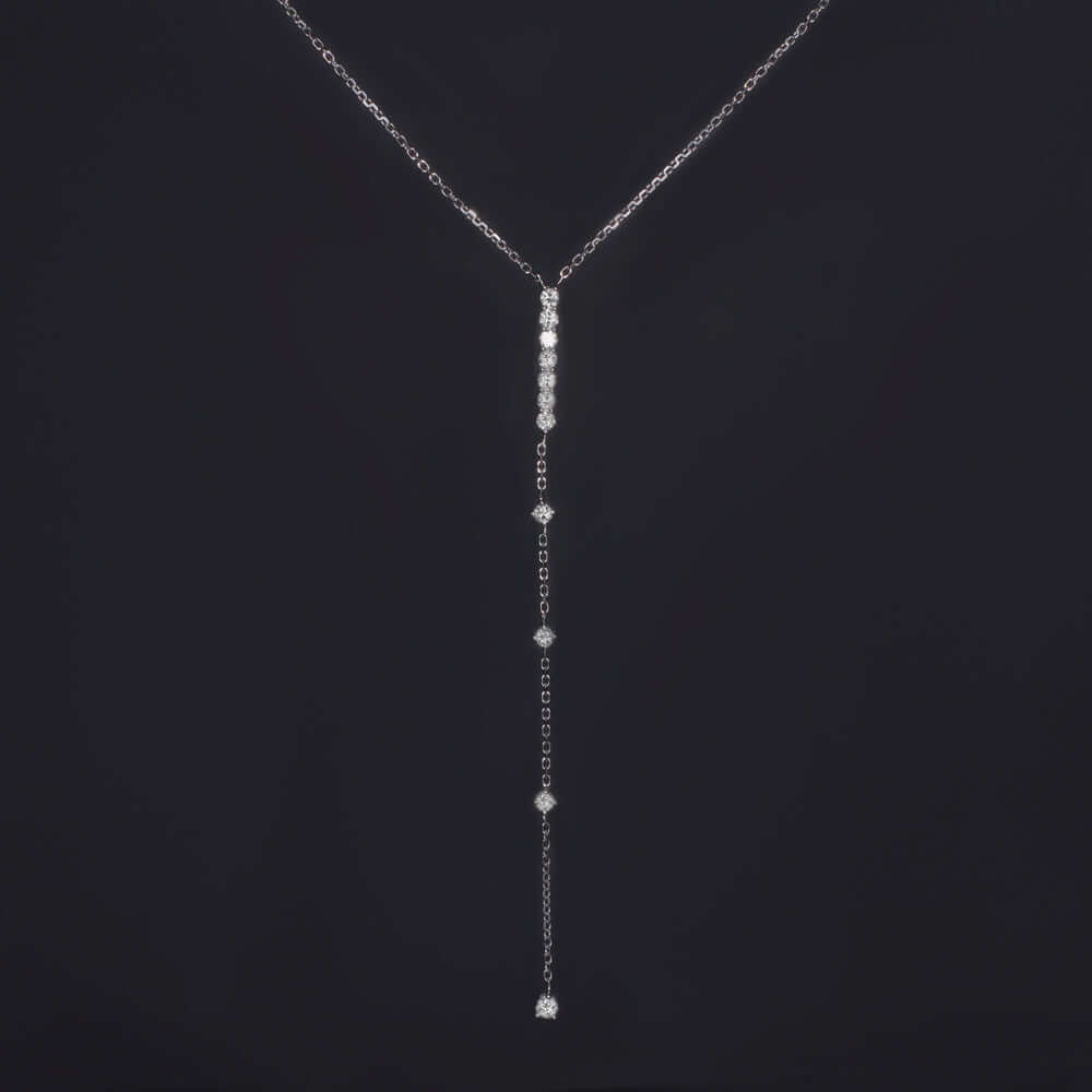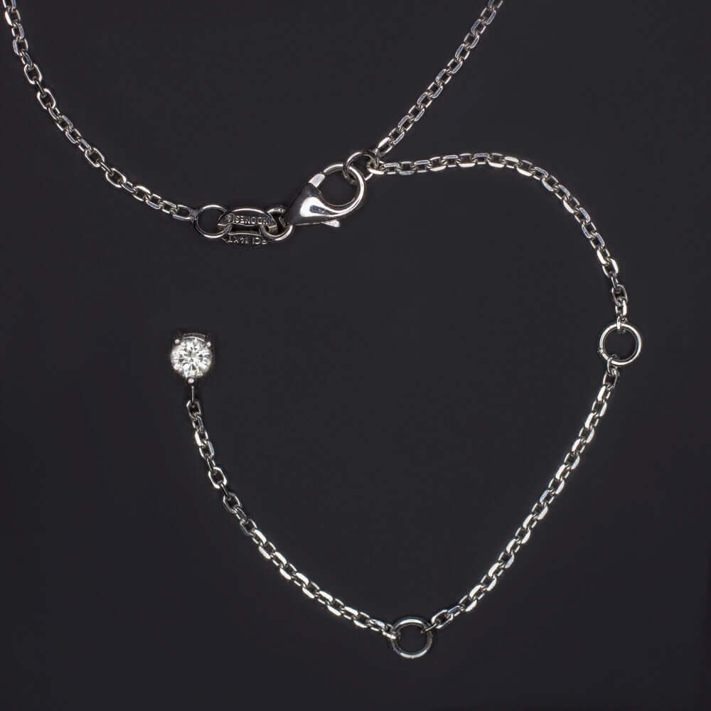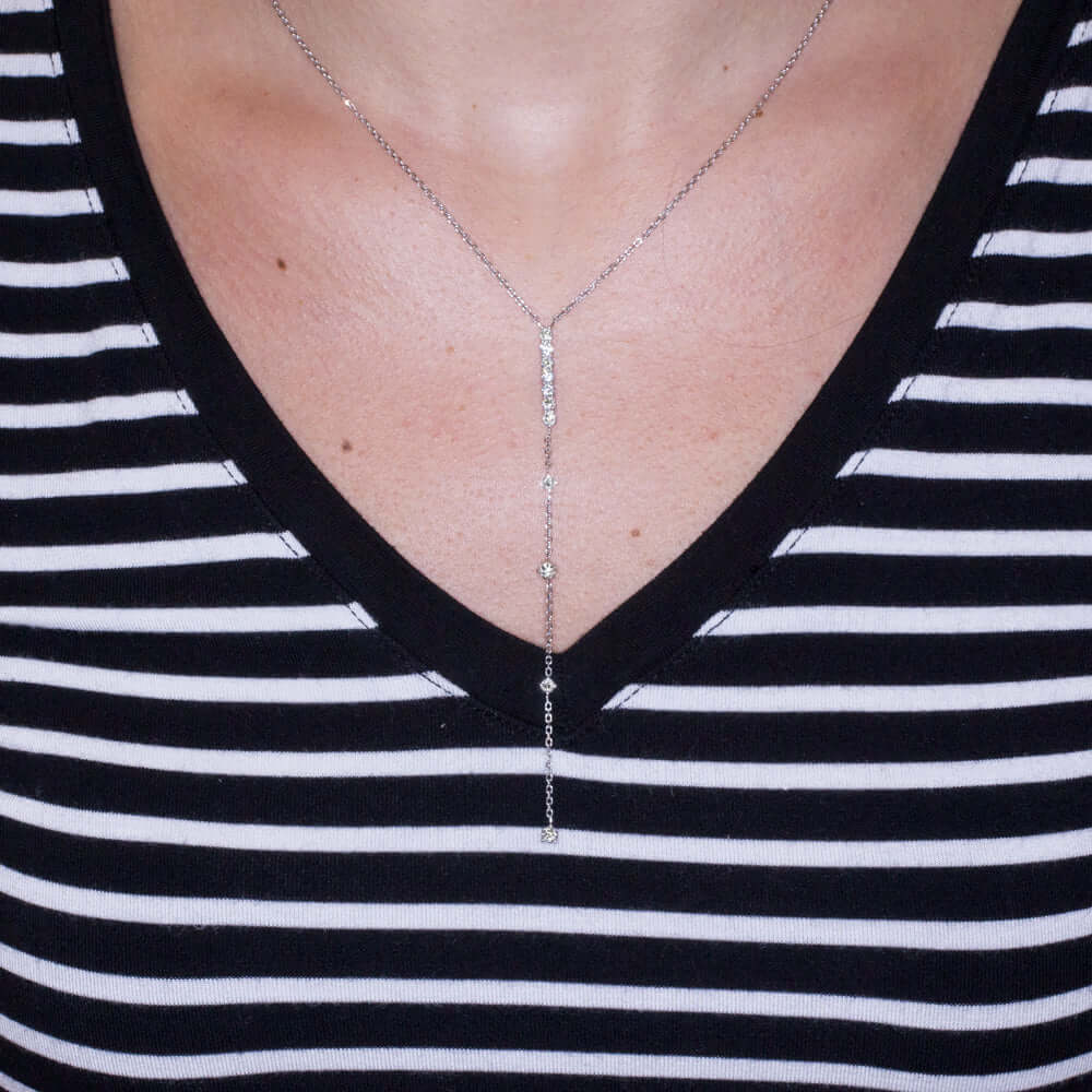 Graded G-H for color, the diamonds are bright white and will stand out brilliantly against any background. Graded SI1-SI2 for clarity, the inclusions are very small and diamonds are all completely eye clean. The diamonds are all very well cut allowing them to sparkle with bright and lively brilliance. This is an important point for a necklace as the diamond’s bright sparkle stands out even when seen from a distance! The diamonds are all earth mined, 100% natural, and have not received any treatments or enhancements of any kind. The 14k white gold chain can be clasped at three different points so that the necklace can be worn at 16, 17, or 18 inches in length. The drop measures 4 inches in length, and the diamond in the back dangles from an additional inch of chain.
