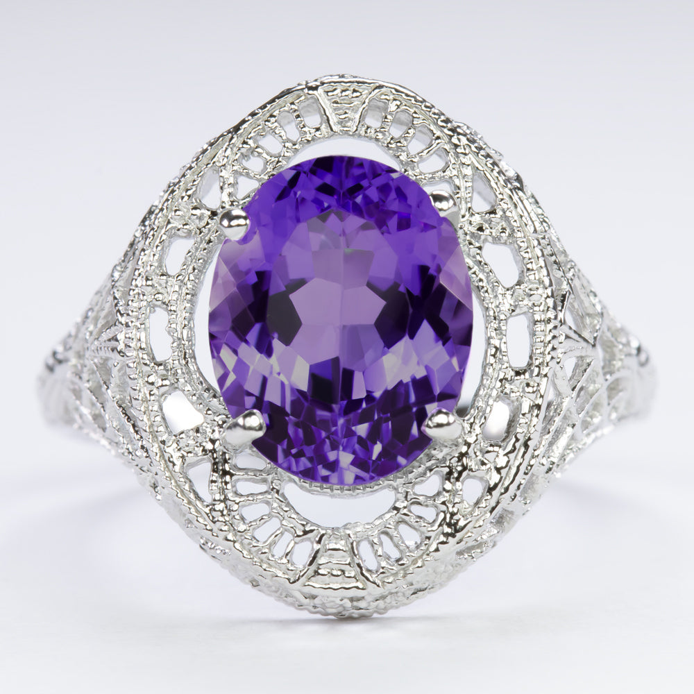 AMETHYST STERLING SILVER RING VINTAGE STYLE OVAL CUT GEMSTONE FILIGREE SOLITAIRE
