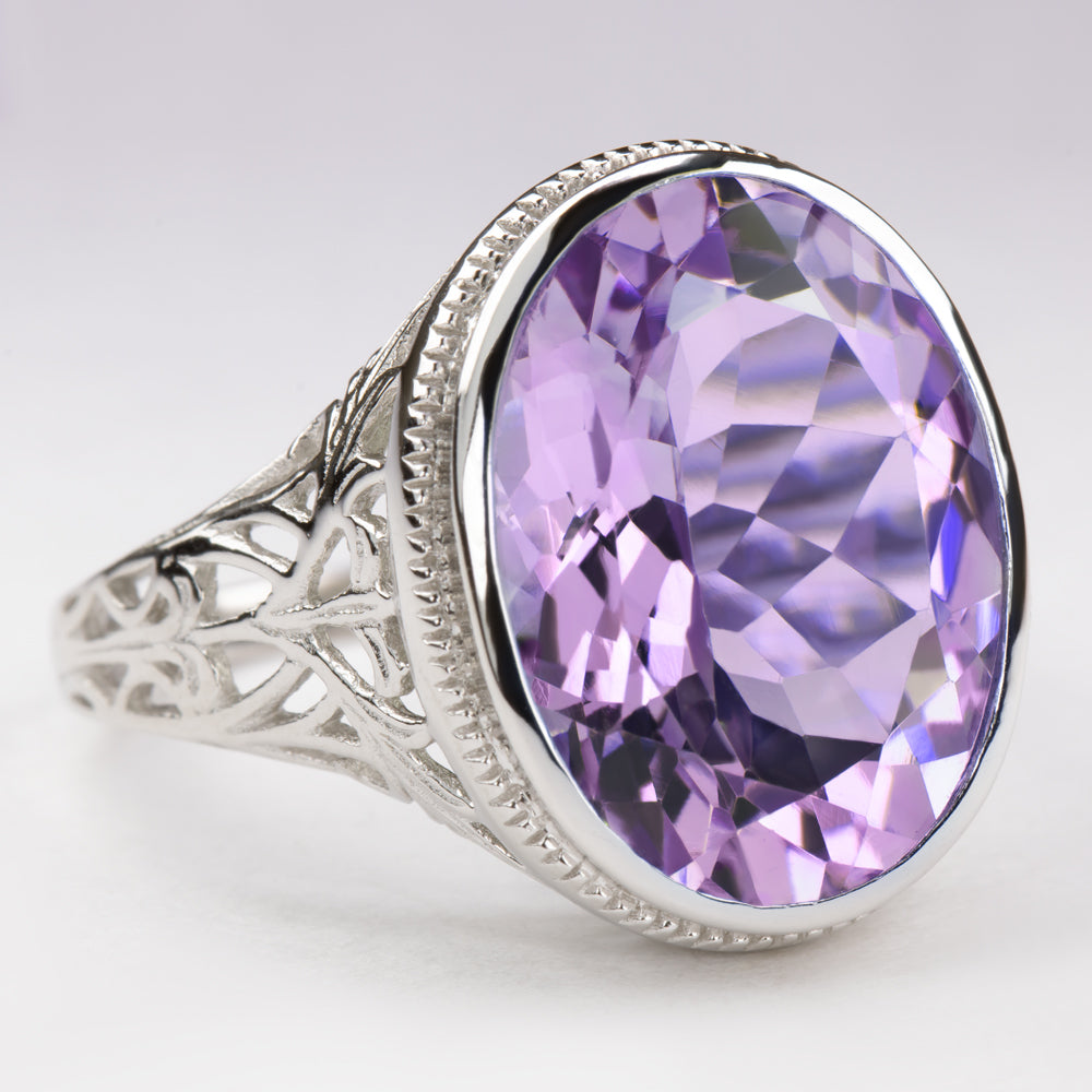 This vintage style ring features an amethyst set in a sterling silver setting. The Art Deco style setting is beautifully crafted with a bezel setting and curling filigree details. The oval amethyst is a natural, earth mined stone. The ring measures 12.8mm across (north south) and 6mm from finger to top.