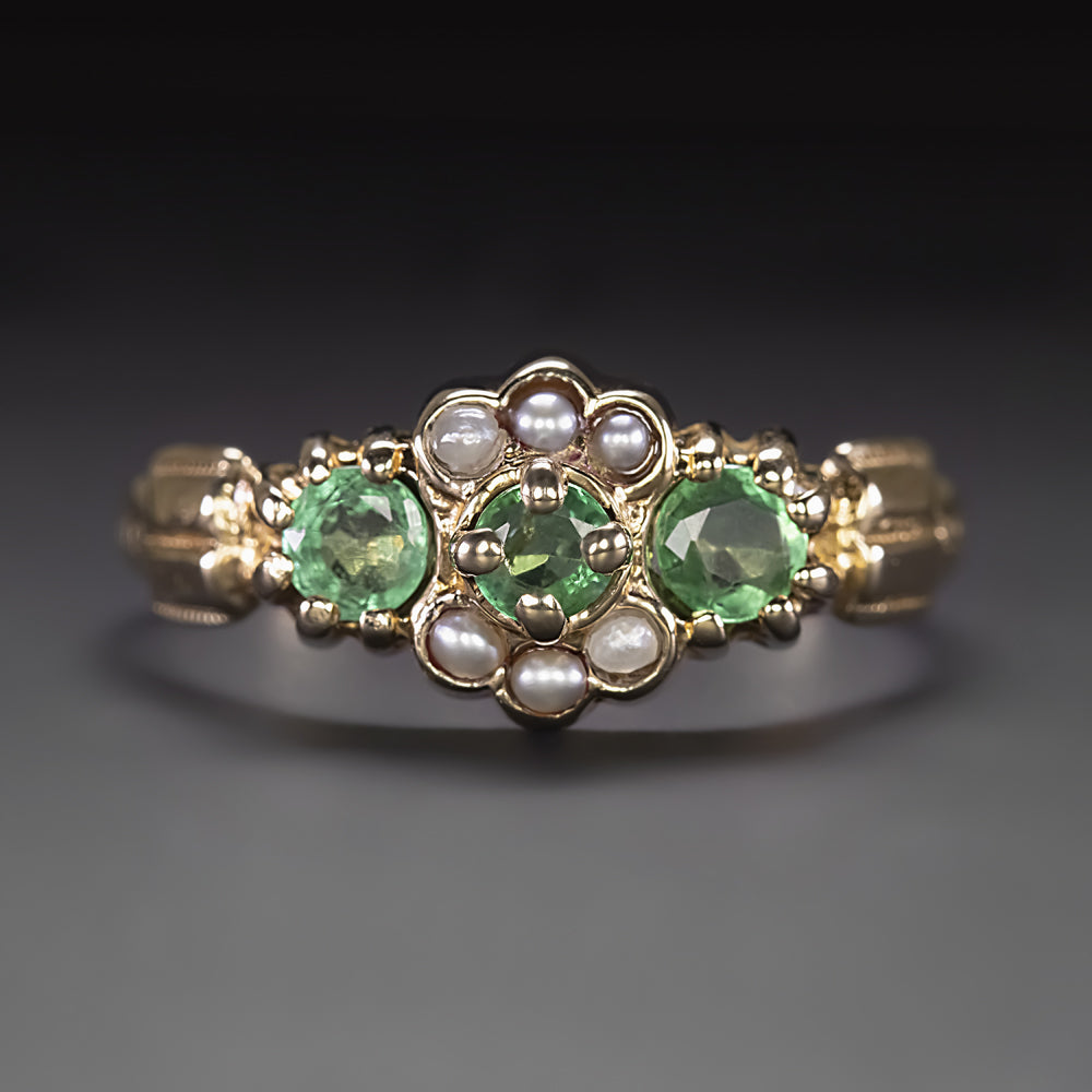 This Art Nouveau era ring features a trio of spring green emerald set off by sweet seed pearl accents!