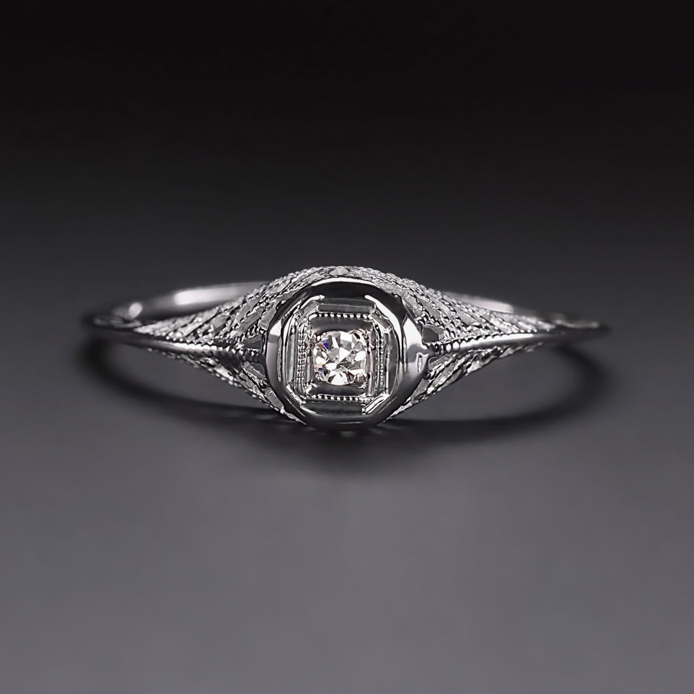 ART DECO DIAMOND SOLITAIRE RING 18K WHITE GOLD FILIGREE VINTAGE PROMISE RING