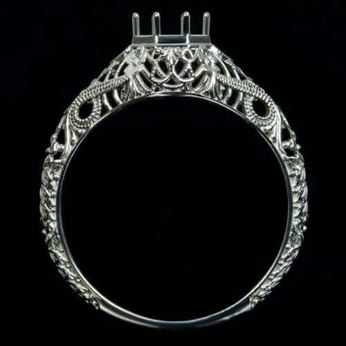 Featured here is a beautiful filigree semi-mount that is a memento of the Art Deco period! This ring is made from a mold of an original vintage piece that we have. It was one of the few rare pieces we have found with very intricate filigree and great detail. The design is timeless and as soon as we saw the original, we fell in love with the ring. The original piece was made in the 1920's and has all of the classic vintage details. The intricate filigree and engraving detail is beautiful! This looks truly like the original vintage piece as the mold was made from the old model. The pictures do not do justice to this piece because in real life you can see all of the small details together and really appreciate the rare early 1900's character of it. We certainly recommend a first hand look. The ring is made from solid platinum and weighs 4.3 grams. It is ideal for a round stone that measures between 5.4mm up to 6.1mm. We can supply a diamond of your choice or popular gemstone that is precious or semi-precious as well. The finger size is 6.5 and can be resized upon request (many sizes up can safely be done). The ring measures 10.5mm across (north-south) and 6.5mm from the finger to the top. This lovely Art Deco ring will only be found here and looks much better in person!