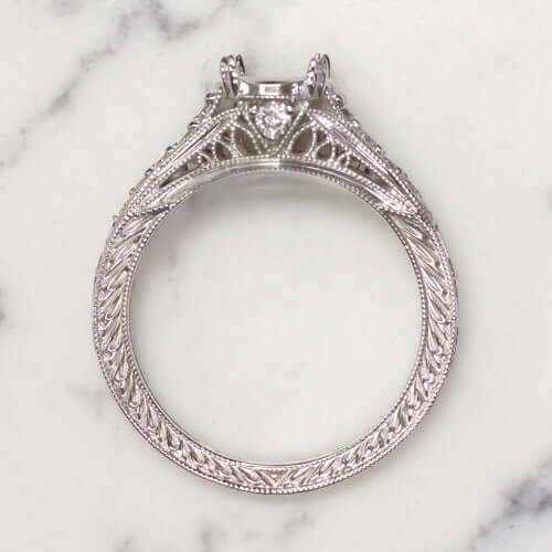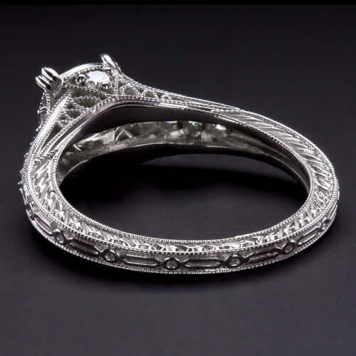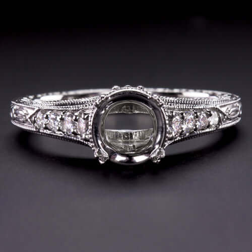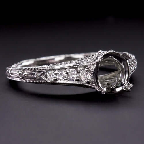 Featured here is a fantastic Art Deco inspired diamond semi-mount ring perfect for a 1 carat diamond! The ring is beautifully finished with highly detailed filigree, engraving and milgrain beading and it must be seen in person to be fully appreciated! All three sides of the ring's shank are engraved and the intricate design goes all the way around the ring in a full eternity. The ring is adorned with ten fully faceted diamonds prong set in the sides and gallery of the ring. They are all bright white and 100% clean to the naked eye with no visible flaws or imperfections. These sparkling diamonds total approximately 0.22ct and will be the perfect complement to any diamond or gemstone chosen for the center! The center mounting is ideal for a round shaped stone that measures 6.5mm, which the overall range being 6.2mm to 6.9mm in diameter. A cushion can also fit with slightly smaller dimensions. If you do not have the perfect stone for this setting, please contact us for our loose stone inventory! We can also create a custom version of this ring for your existing center stone. This ring is made from solid 14 karat white gold and features wonderful Art Deco inspired design. The engraving and filigree details are crisp and sharp. The measurements are 7mm across (north-south) and 7mm from the finger to the top of the center mounting. Make this gorgeous Art Deco inspired semi-mount part of your collection! This one of a kind design can only be found here!