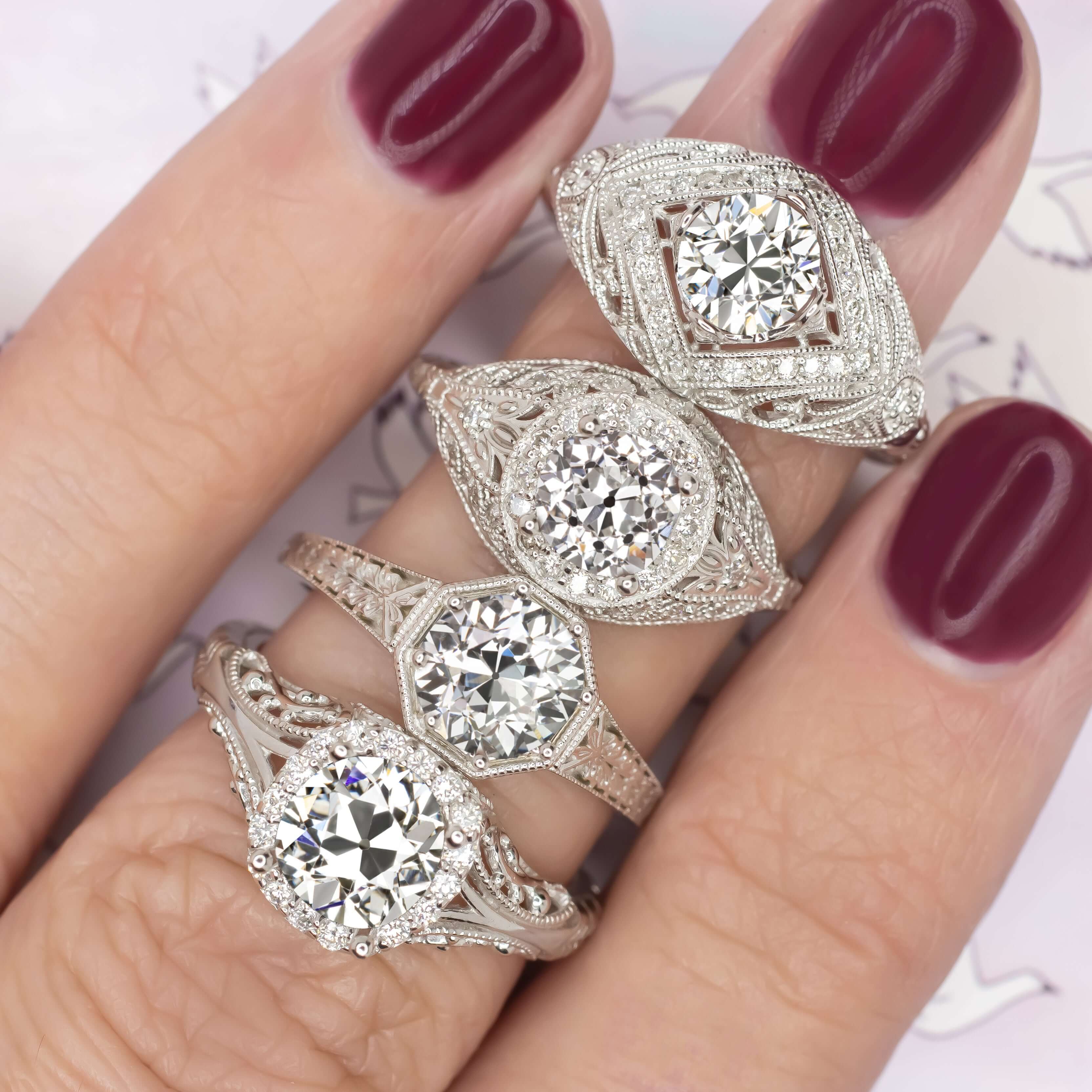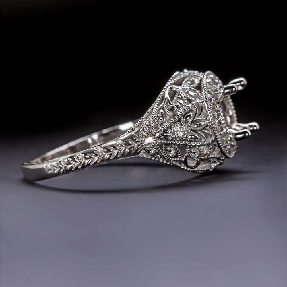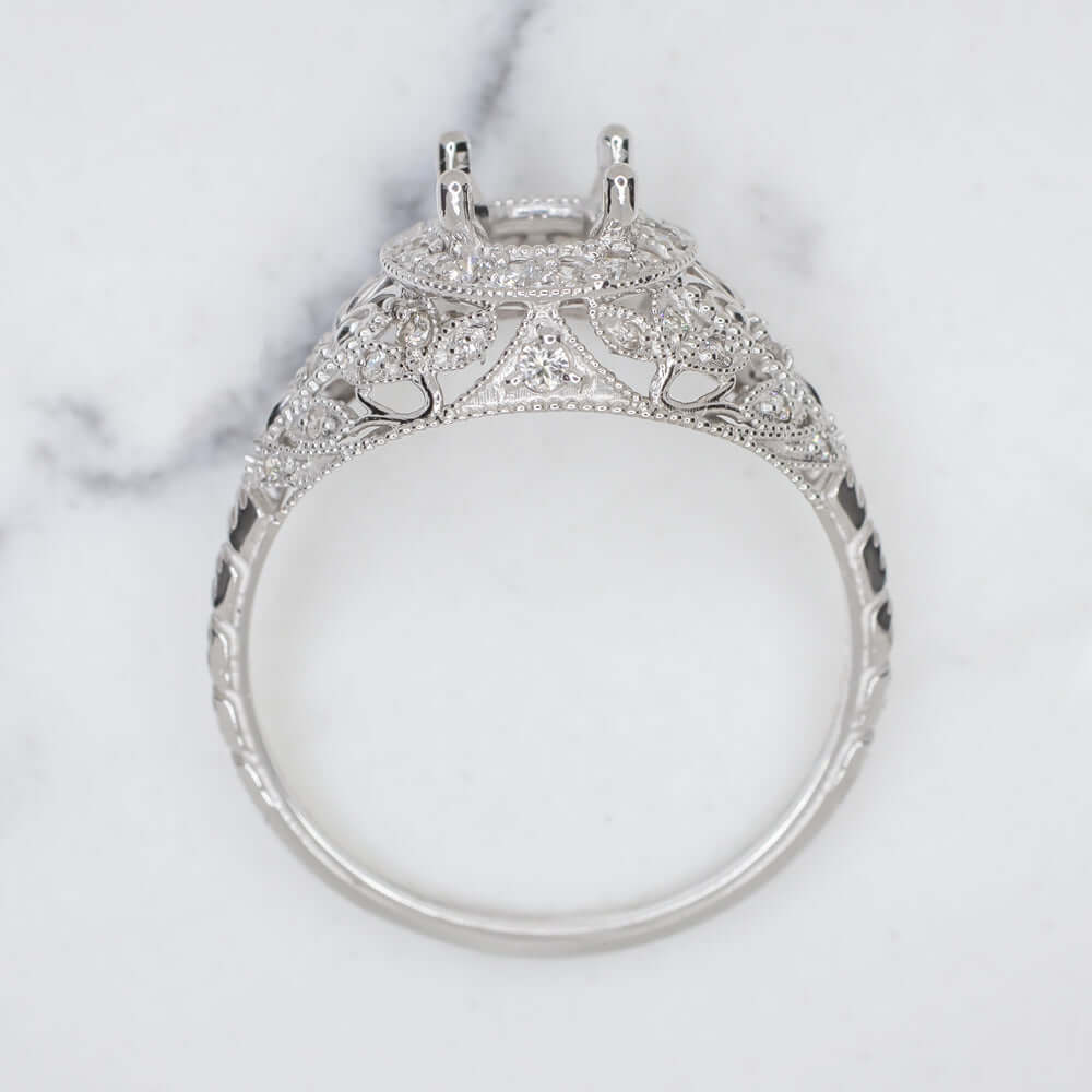 This elegant diamond and 14k white gold vintage style semi-mount is beautifully designed with romantic floral details, richly textured engraving, and graceful filigree! Timelessly chic, this setting provides the perfect backdrop for a diamond or gemstone of your choice. The prong setting is surrounded by a glittering diamond halo, and the intricate botanical details are generously studded with even more diamonds. Classically fashionable and sophisticated, this setting beautifully captures the class and grace of antique metalwork! The setting can fit a round center stone measuring 5.1mm to 6.3mm in diameter. The ideal size is 5.5mm. We also sell a smaller version of this ring that will fit a stone from 4.1mm - 5.0mm (4.5mm ideal for that one). Please contact us if you are looking for a diamond or gemstone to be set in the center as we have a large inventory of precious stones. We can also recreate this ring for your center stone, please inquire for a custom variation of this design. We are a full service manufacturer that produces our jewelry in our Chicago shop.