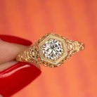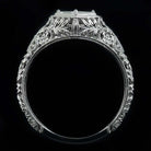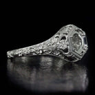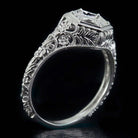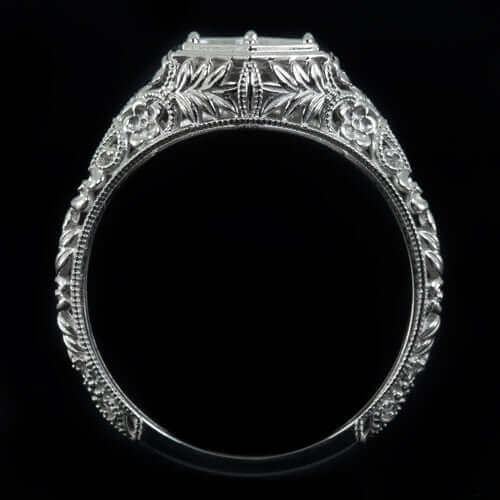 Featured here is a stunning early 1900s inspired ring setting that is highly detailed with fine engraving and filigree work! This is high level detail that will not be found anywhere else for this price. It must be seen in person to be fully appreciated as its a gorgeous piece of art. This beautiful solitaire setting will fit a round stone from 5.7mm to 6.3mm in the center. This gorgeous ring is reminiscent of the Art Nouveau period and its design features intricate filigree and engraved details in wonderful patterns and designs. This ring must be seen in person to be fully appreciated! This setting is made from solid 14 karat white gold and measures 10.2mm across (north-south) and 4.7mm from the finger to the top of the center mounting. Make this gorgeous vintage inspired engagement ring setting part of your collection! This one of a kind design can only be found here!