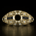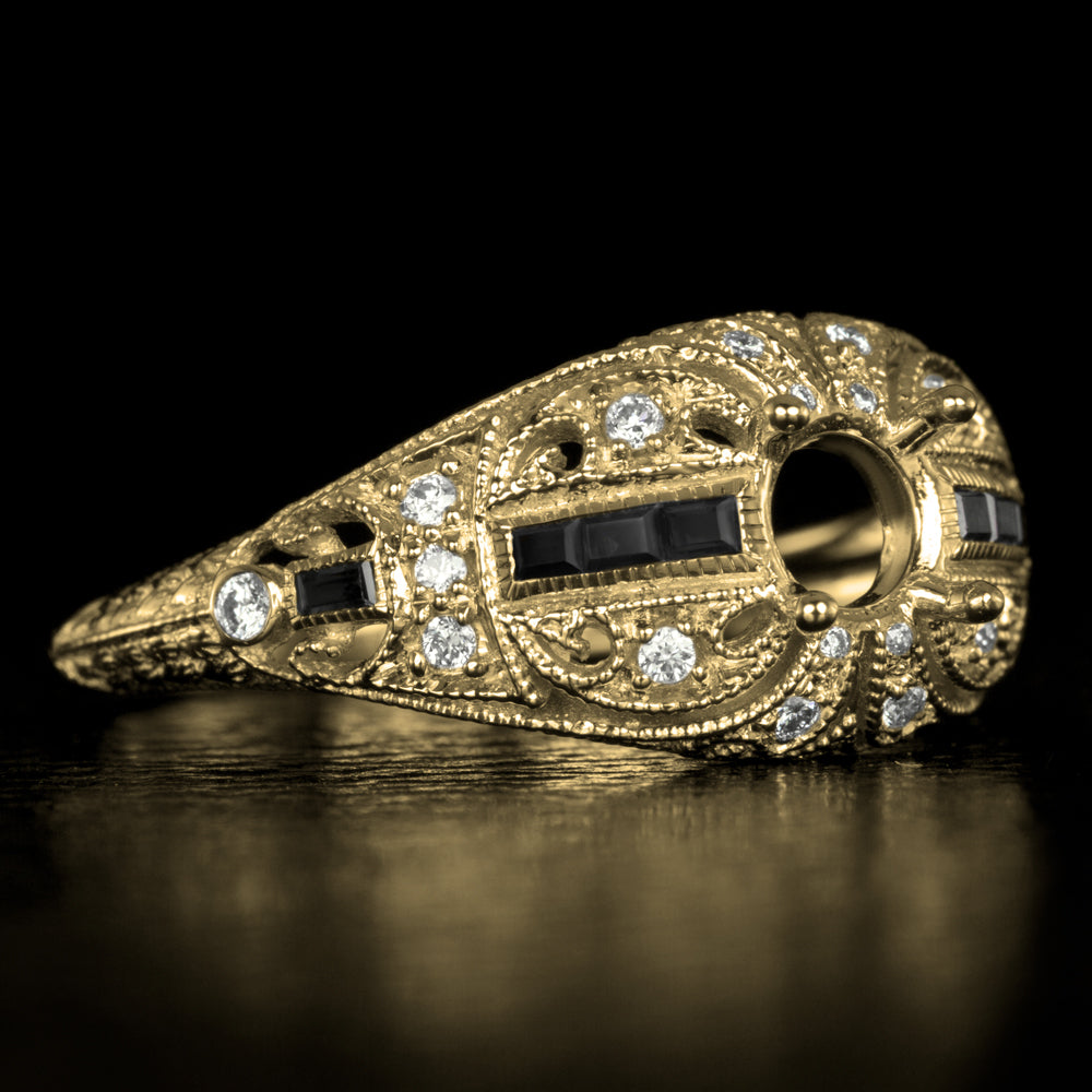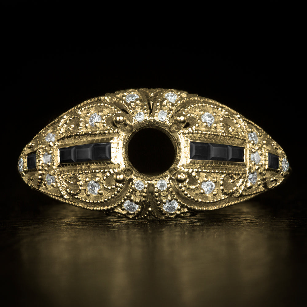 This diamond and black onyx semi mount setting has an iconic Art deco design. The diamond and black onyx studded domed setting is richly detailed with engraving, cut outs, and fine milgrain.