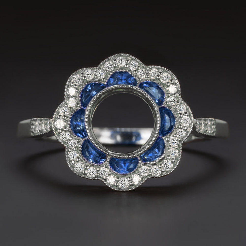 BLUE SAPPHIRE DIAMOND VINTAGE STYLE ENGAGEMENT RING SEMI MOUNT SETTING FLORAL