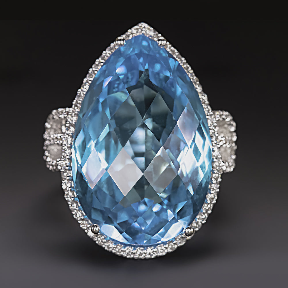 Featuring a stunning 30 carat blue topaz surrounded by a glittering diamond halo, this cocktail ring has a glamorous and eye-catching look!