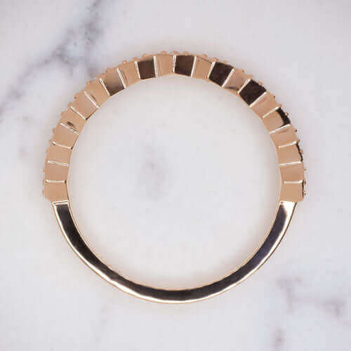 This gorgeous diamond and 14k rose gold band is effortlessly elegant with vibrant natural diamonds and a chic, flattering design with subtle geometric touches! The 14k rose gold band shimmers with 11 bright white and eye clean diamonds set in milgrain finished hexagonal settings. The diamonds stand out stunningly against the blush warmth of the 14k rose gold settings. The pretty, honeycomb-like design brings a touch of vintage romance to this ring’s modern elegance and glamour. It is a classic Art Deco look that is very popular today. This timelessly stylish diamond ring is a perfect choice for an enduring wedding band, right hand ring, or stylish stacking ring!