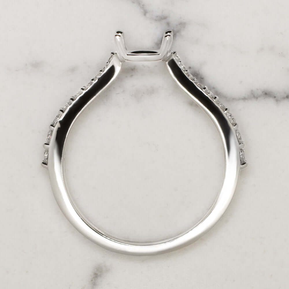 Full of bright sparkle and flattering in design, this setting provides the perfect complement for a dazzling center. Set with a center stone of your choice, it would make a gorgeous engagement or cocktail ring!