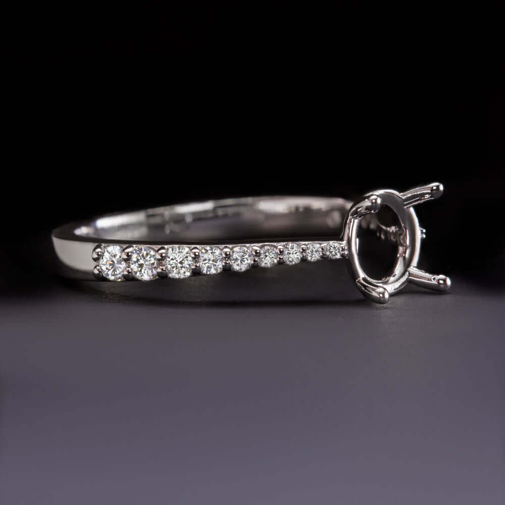 This classic diamond accented semi-mount ring is beautifully designed to showcase a diamond or gemstone of your choice. The shank is gracefully tapered and set with graduated diamonds giving the ring an elegant look and creating the illusion of a larger center stone. The diamonds are all very well cut, so they sparkle with remarkable, vibrant brilliance. The setting can fit a round cut center stone with measurements ranging from 5.5 - 7.0mm in diameter. The ideal fit is 6.0 - 6.8mm. This would be perfect for a round cut diamond from 0.90 to just over 1 carat. We can also exchange the head to accommodate diamonds with other cut shapes. Please contact us if you would like to make this modification or if you are looking for a diamond or gemstone to be set in the center.