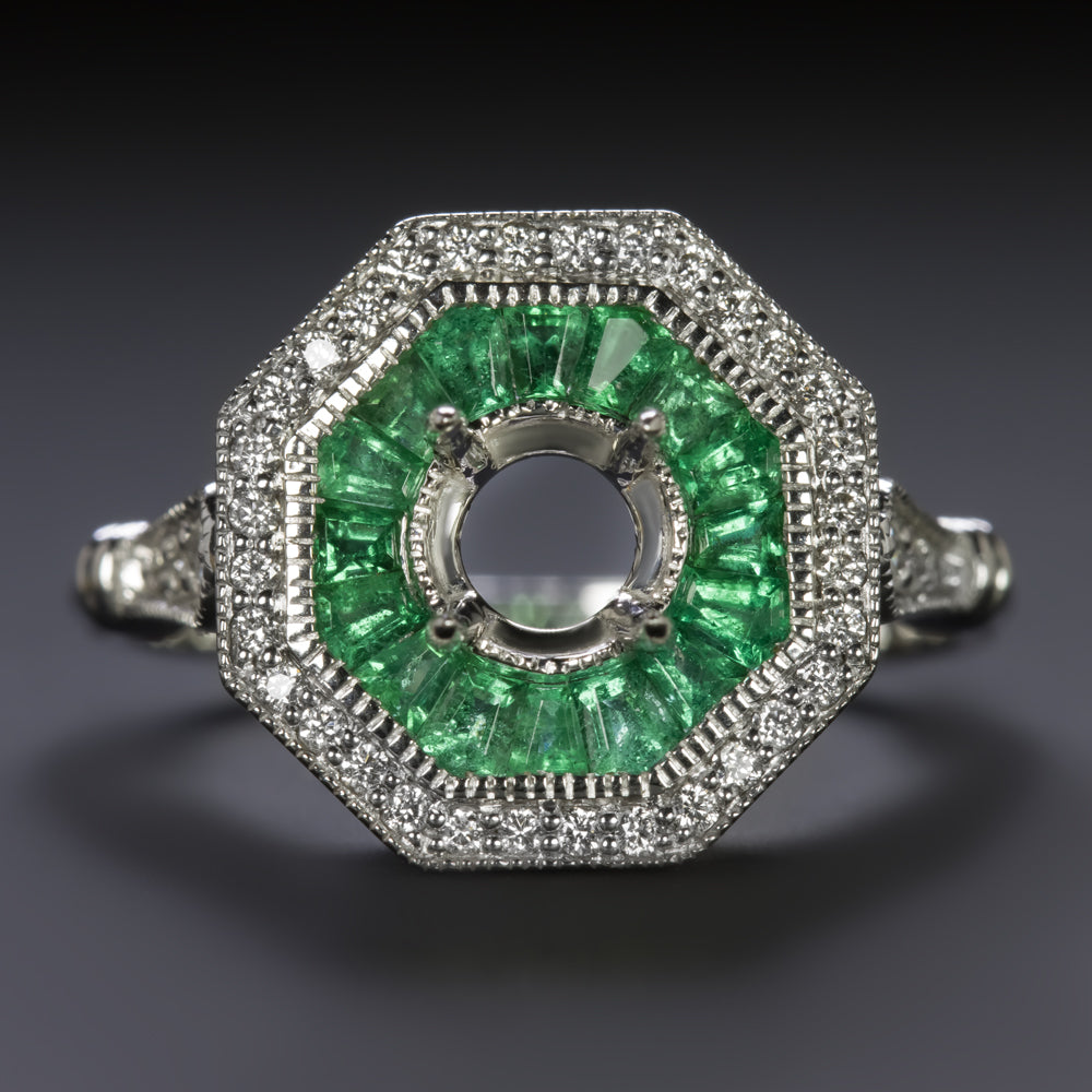 This diamond and emerald semi mount setting has an iconic Art deco design with an octagon shaped double halo of glittering diamonds and bright spring green custom cut emeralds.