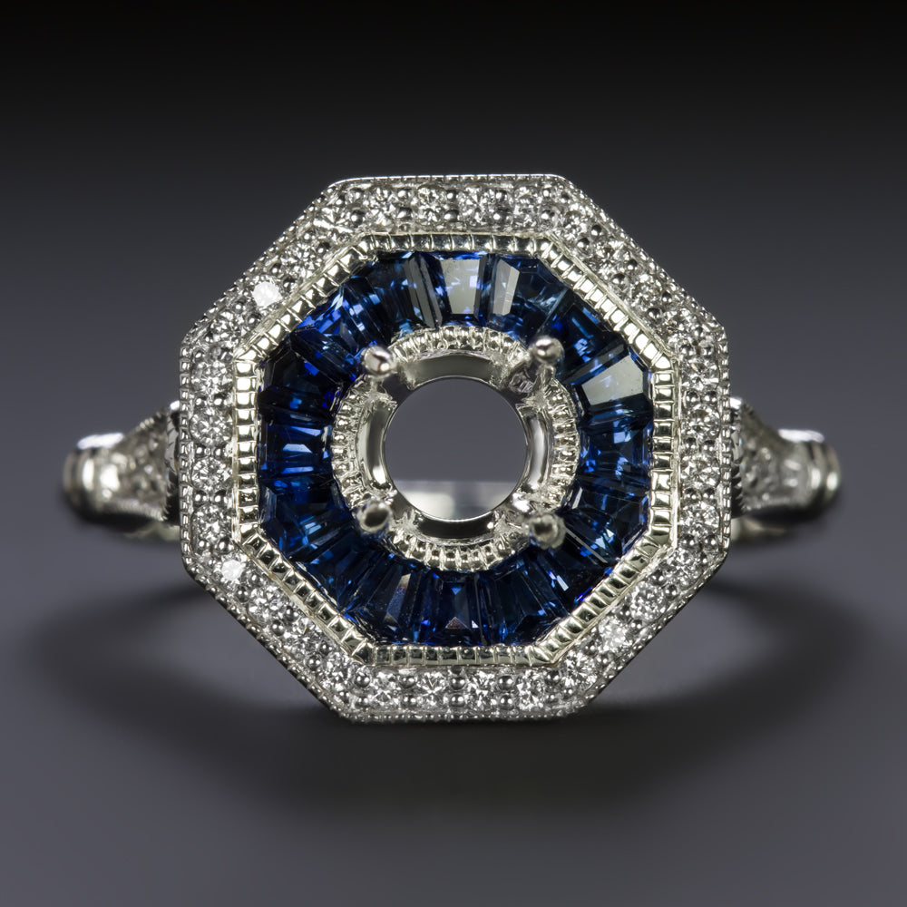 This diamond and sapphire semi mount setting has an iconic Art deco design with an octagon shaped double halo of glittering diamonds and rich blue custom cut sapphires.