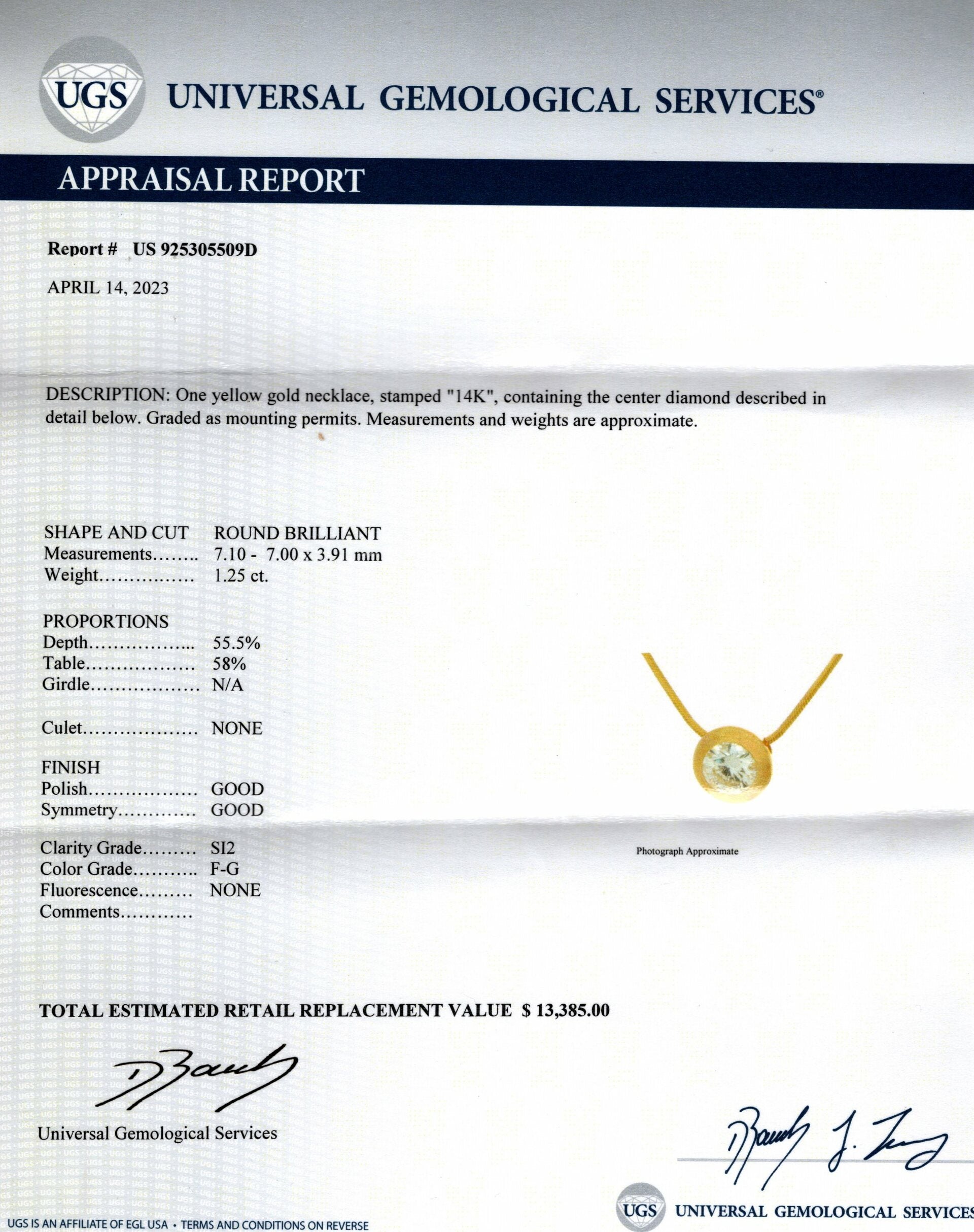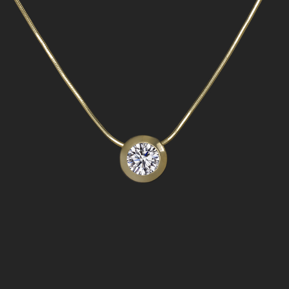 DIAMOND SOLITAIRE NECKLACE 1.25 CARAT ROUND 14k YELLOW GOLD BEZEL SNAKE CHAIN