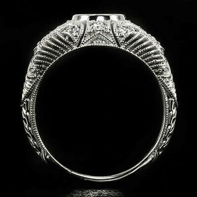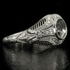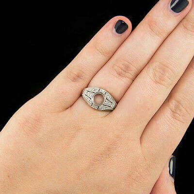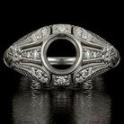 Featured here is a gorgeous diamond semi-mount with absolutely stunning Art Deco inspired details! Once fit with a center stone, this beautiful piece will make a wonderful engagement or cocktail ring that is sure to impress! This bezel set semi-mount will fit round stones from 5.8mm - 6.4mm though the ideal size for looks and ease of setting is 6mm - 6.2mm. Up to 6.4mm looks great too but the metal does have to be thinned in order to fit that stone. If you do not have a perfect diamond or gemstone for this ring, please contact us for our loose stone inventory. We are sure to have something you will love that will be the perfect complement to this setting. For a touch of lovely sparkle, 18 round cut diamonds adorn this piece. These diamonds are bright white and 100% clean to the naked eye with no visible imperfections or flaws. These glittering diamonds will be the perfect complement to any gemstone chosen for the center! The ring is made from solid 14 karat white gold and features gorgeous Art Deco inspired design with geometric and floral imagery, perfected with milgrain for a finishing touch. The filigree and engraved details are quite stunning with a beautiful intricacy and old world feel. This piece has perfectly captured the elegance and glamour of the early 1900's and must be seen in person to be fully appreciated! The ring weighs 3.9 grams and it is a finger size 6.25 which can be resized upon request. The measurements are 10.8mm across (north-south) and 4.6mm from the finger to the top of the bezel setting. Make this Art Deco inspired semi-mount ring yours before it has sold!