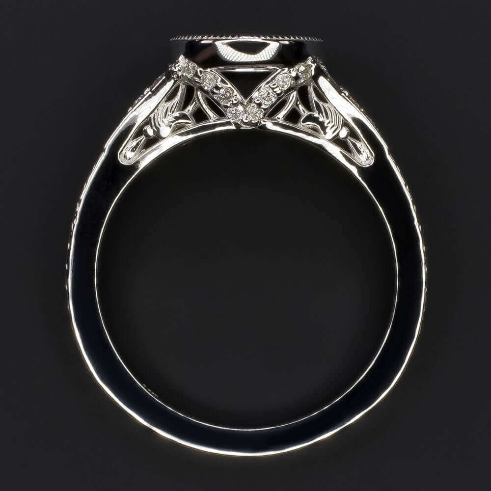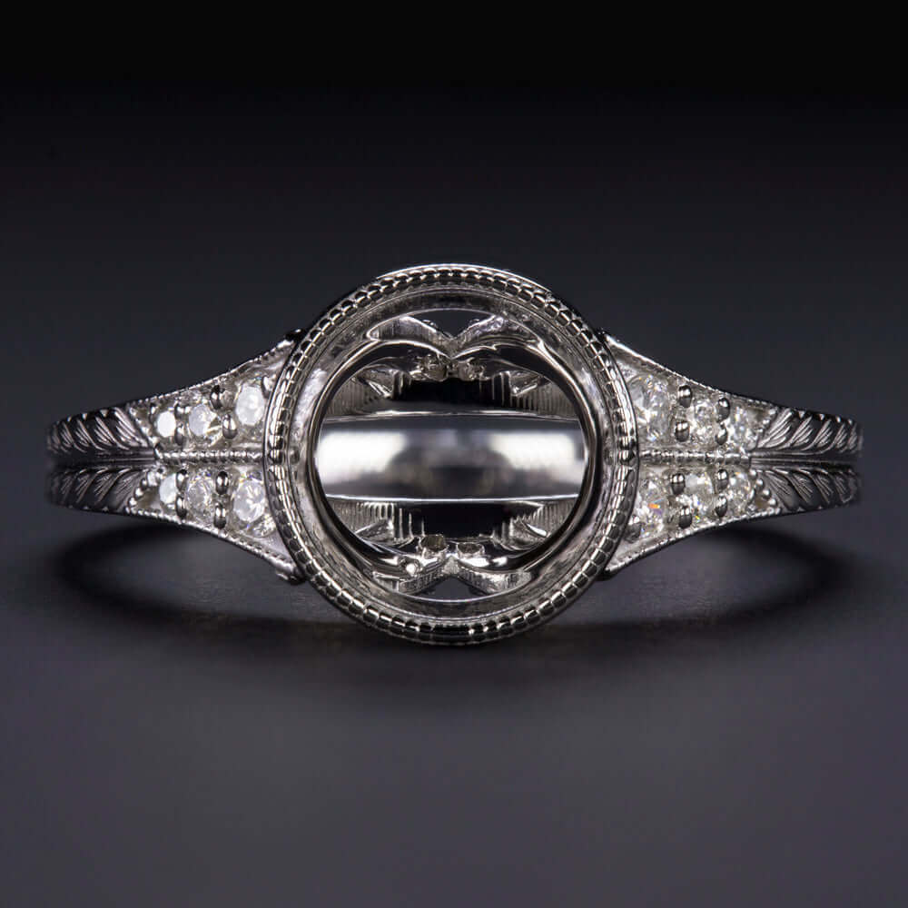 This gorgeous vintage inspired semi-mount ring is beautifully designed to capture the class and grace of the Art Deco era! The setting features glittering, diamond accented shoulders and richly textured engraving! The bezel setting offers a sleek look and excellent security. Timelessly sophisticated, this setting provides the perfect backdrop for a diamond or gemstone of your choice. The setting can fit a round cut center stone measuring approximately 8mm in diameter. We can also modify the design to fit other shapes and sizes. Please contact us if you are unsure if your stone will fit. We offer a large selection of loose diamonds and gemstones and would be happy to assist you in finding a center to complete this ring. Additionally, as a custom jewelry manufacturer, we do offer stone setting services to complete the finished product. We are a full service jeweler with on-staff stone setters that can complete this beautiful piece for you. The diamonds are brilliantly white, graded G-H for color. Graded SI1-SI2 for clarity, they are all eye clean and stunningly vibrant. The diamonds are all completely natural earth mined and have not received any treatments or enhancements. The setting is made of solid 14k white gold. The ring measures 9.3mm across (north south) and 5.6mm from finger to top. This chic Art Deco inspired semi-mount is timelessly elegant, and classically stylish! Set with a center stone of your choice, it would make a gorgeous engagement or cocktail ring!