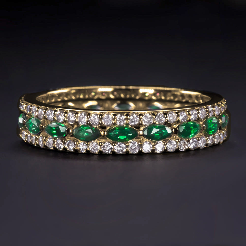 EMERALD DIAMOND WEDDING BAND ETERNITY RING 3 ROW STACKING MARQUISE NATURAL GOLD