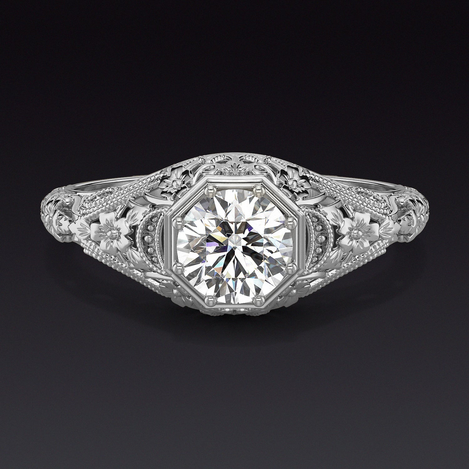 Featured here is a beautiful filigree semi-mount that is a memento of the Art Deco period! This ring is made from a mold of an original vintage ring that we had. It was one of the few rare pieces we have found with very intricate filigree and great detail. The design is timeless and as soon as we saw the original, we fell in love with the ring. The original piece was made in the 1920's and has all of the classic vintage details. The intricate filigree and engraving detail is beautiful! We certainly recommend a first hand look. The ring is made from solid 14 karat white gold and weighs 2.4 grams. All of our ring settings may be made in various gold colors and metal types on request. It is ideal for a round stone that measures between 5.4mm up to 6.1mm. We can supply a diamond of your choice or popular gemstone that is precious or semi-precious as well. The ring measures 10.5mm across (north-south) and 6.5mm from the finger to the top. This lovely Art Deco ring will only be found here and looks much better in person!