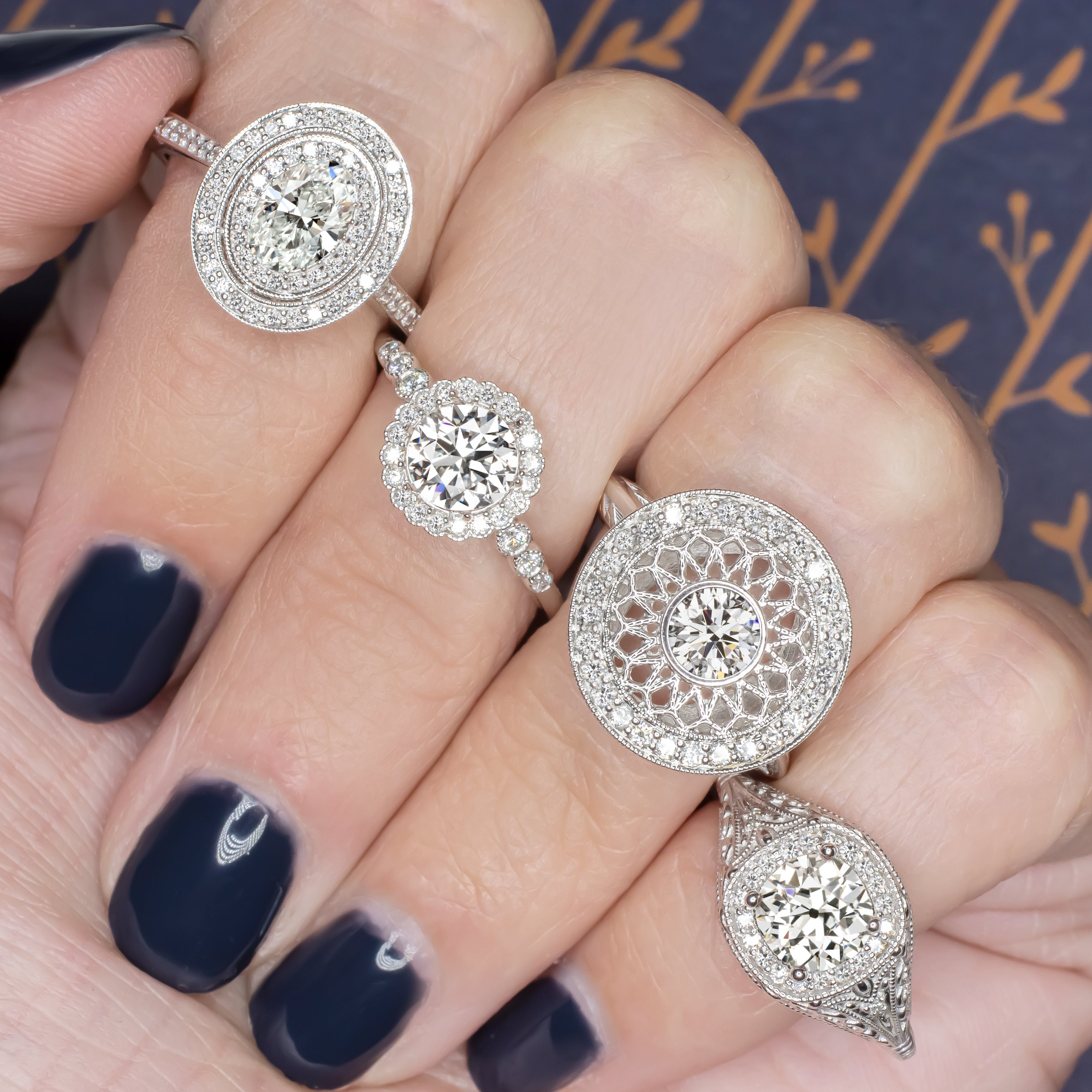 G VS DIAMOND HALO VINTAGE PLATINUM ENGAGEMENT RING 6MM ROUND SETTING ART DECO