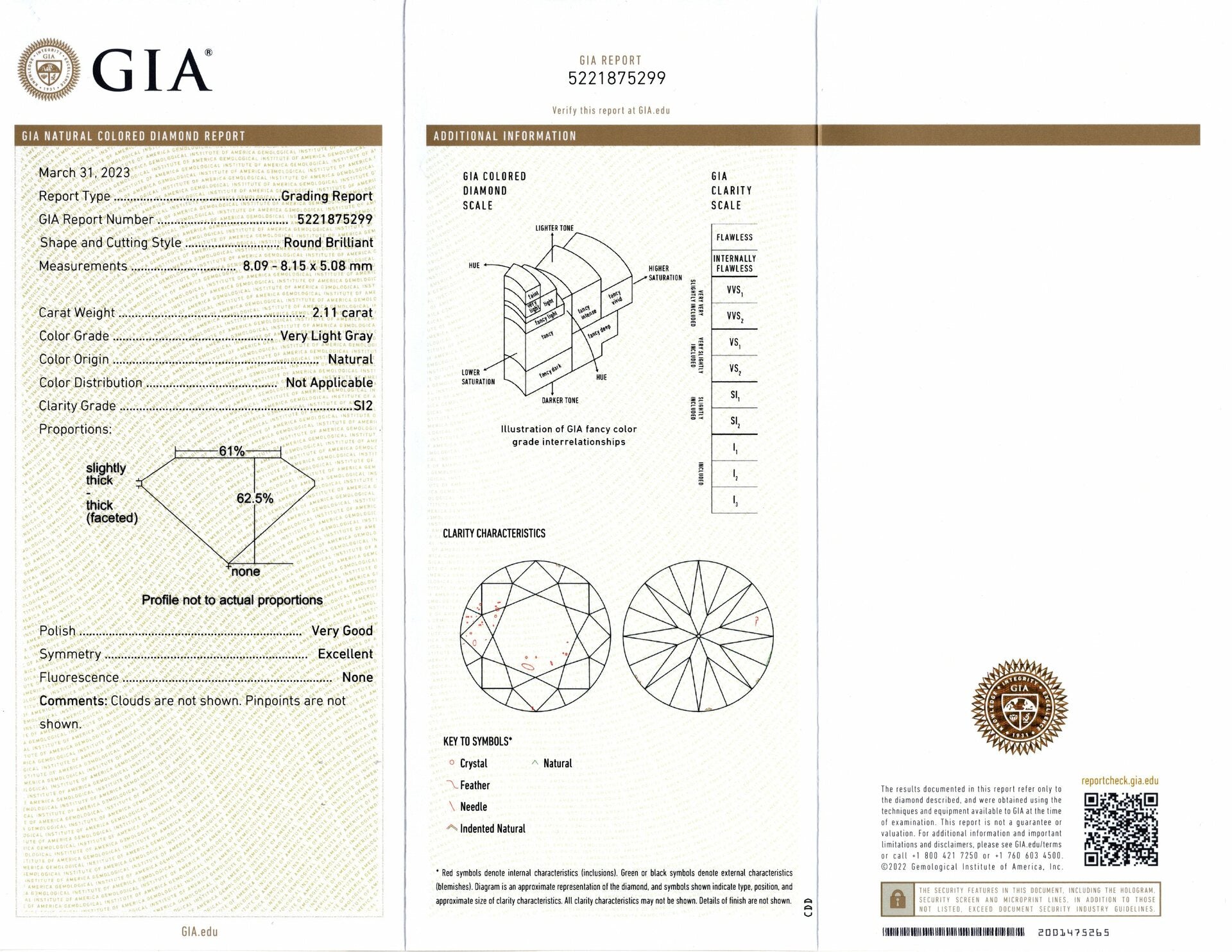 GIA CERTIFIED LOOSE DIAMOND LIGHT GRAY SI2 EXCELLENT ROUND BRILLIANT CUT 2.11ct