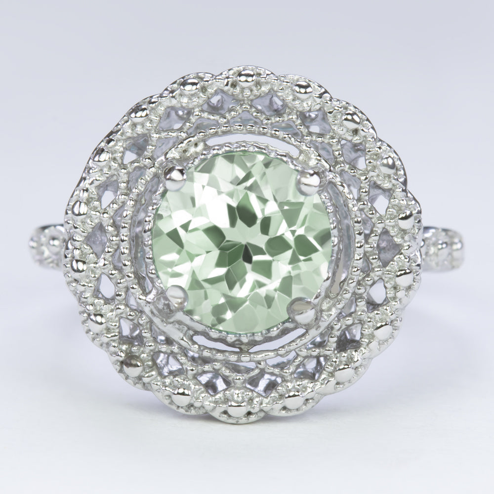 GREEN AMETHYST STERLING SILVER RING VINTAGE STYLE FILIGREE HALO ROUND ART DECO