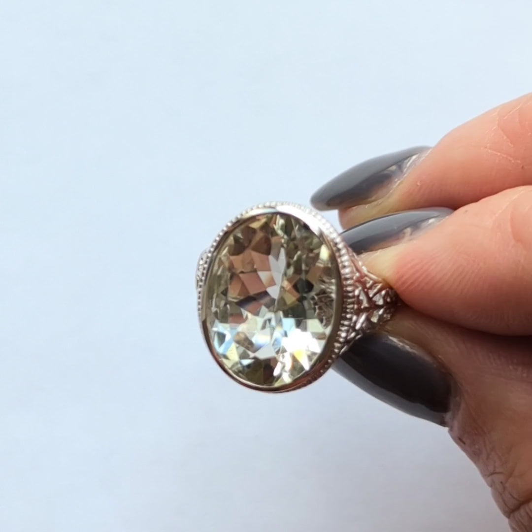 This vintage style ring features a prasiolite (green amethyst) set in a sterling silver setting. The Art Deco style setting is beautifully crafted with a bezel setting and curling filigree details. The oval prasiolite is a natural, earth mined stone. The ring measures 12.8mm across (north south) and 6mm from finger to top.