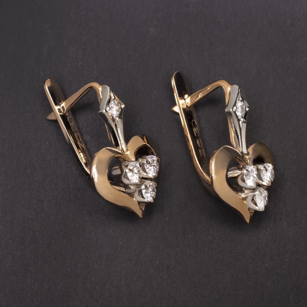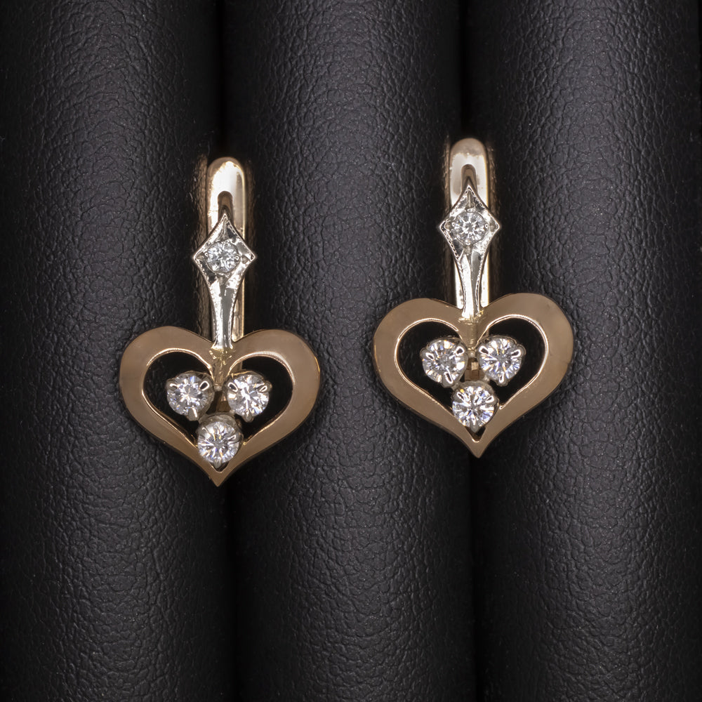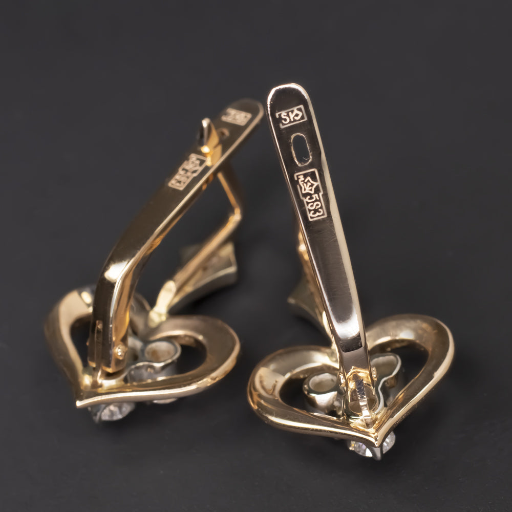 MID CENTURY VINTAGE DIAMOND EARRINGS HEART SHAPE 14k ROSE GOLD SOVIET ESTATE