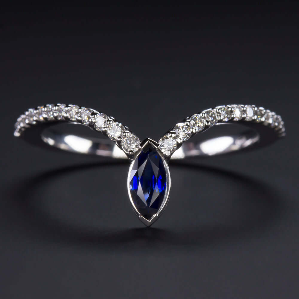 NATURAL DIAMOND SAPPHIRE V RING CHEVRON WHITE GOLD CURVED CONTOUR WEDDING BAND