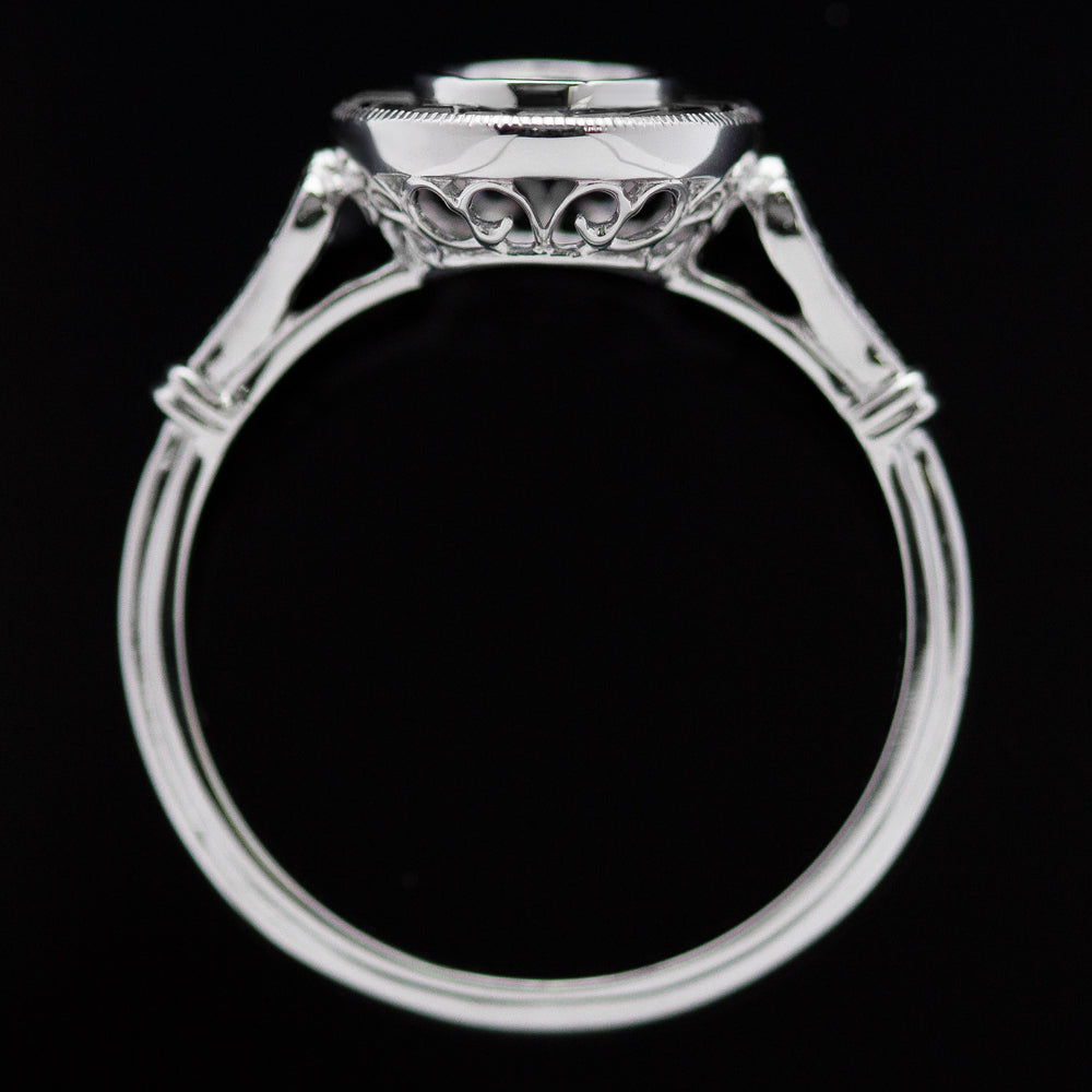 The diamonds are brilliantly white, graded G-H for color. Graded VS2-SI2 for clarity, they are all completely eye clean, stunningly vibrant, and well cut. The onyx is a deep black that contrasts strikingly with the diamonds and the white gold. The diamonds and onyx are natural, earth-mined stones. The onyx are cut and set with exceptional craftsmanship. Each onyx is individually cut to fit in the setting with zero gaps. This is a highly skilled and labor intensive process that truly makes this setting a work of art! The setting is made of solid 14k white gold, and the gallery is beautifully embellished with elegant filigree curls. The ring measures 9.9mm across (north south) and 4.6mm from the finger to the top of the mounting. This ring comes with a three month warranty as long as we set the center stone for you.