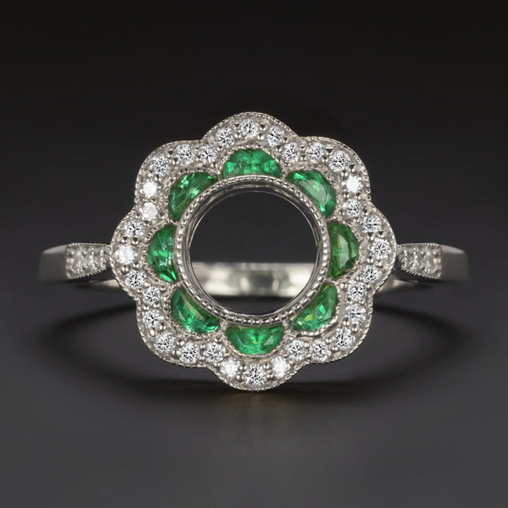 Featured here is a gorgeous diamond and emerald halo engagement ring setting! This unique floral ring was inspired by the 1900s and is full of vintage charm. The bezel setting is great for a round stone that measures 5.9mm to 6.1mm and the ideal size is 6.0mm. If you do not have the perfect stone for this center, be sure to contact us for our loose stone inventory! We are sure to have something that will look complement the ring perfectly. Once set with a center, this ring will make a wonderful engagement ring, or great addition to your own jewelry collection. The halo of emeralds are all natural gemstones that have been custom cut to fit this exact ring. They have wonderful saturation and hue that must be seen in person to be fully appreciated. Complementing the emerald halo, is a halo of diamonds. These diamonds are all natural stones, that are bright white and 100% eye clean. They are also well cut resulting in remarkable sparkle and brilliance! The ring is made of solid 14 karat white gold and measures 12.3mm across (north-south) and 3.7mm from the finger to the top of the ring. We are also offering this ring in limited quantities with blue sapphires in white gold or rubies in white or rose gold. We are also offering this style with a smaller center size of approximately 4.7mm also available in the same color gemstone combinations. Included with the sale is a three month warranty on this particular ring presuming that we set the center stone for you. Make this beautiful floral emerald and diamond semi mount yours before it has sold!