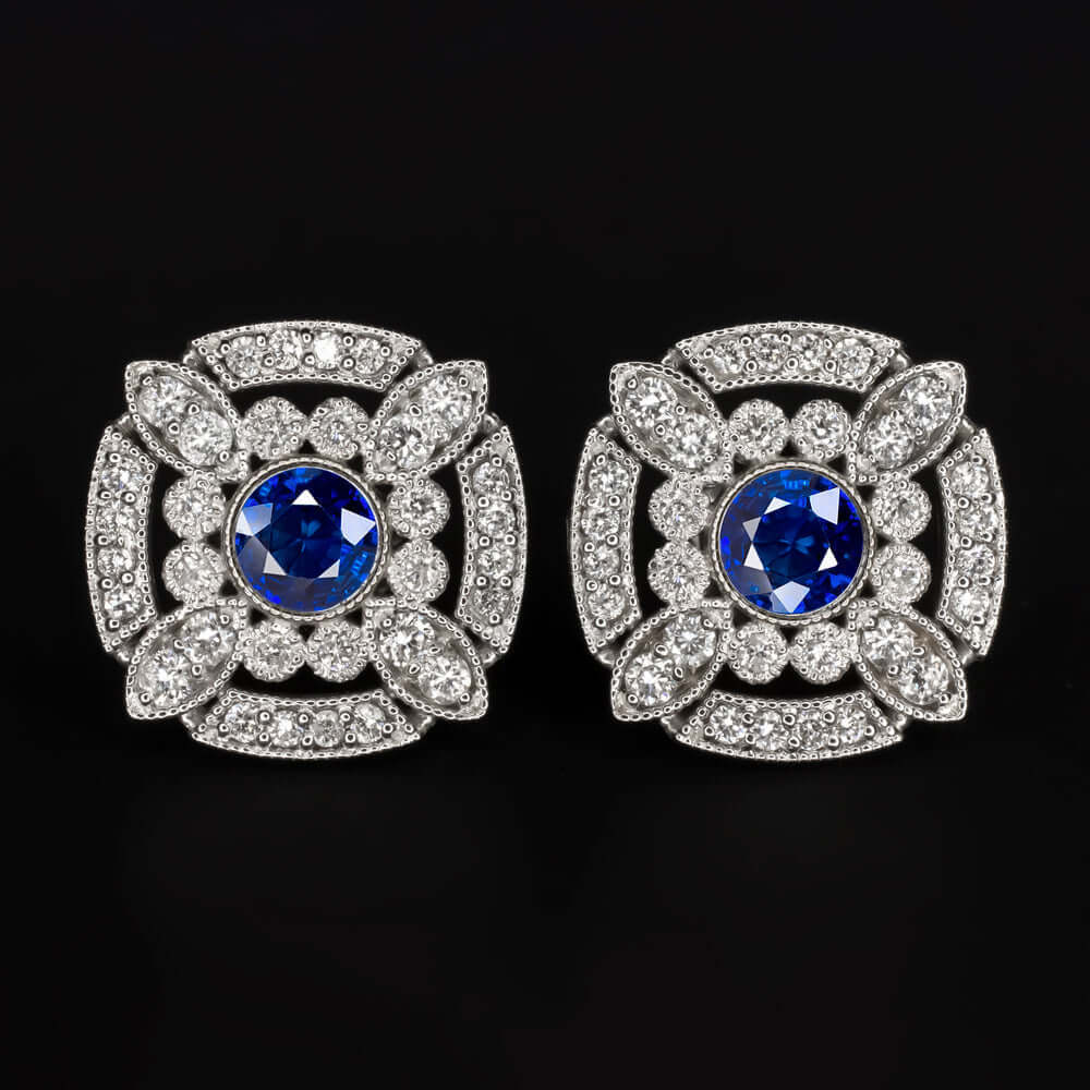 The sapphires total 0.66ct, and have a beautiful rich blue color. The diamonds total 0.40ct and have a substantial impact. The stones are all well cut and have great brilliance and fire! Graded G-H for color, they are bright white and show absolutely no warmth. With clarity grades of SI1-SI2, they are completely eye clean and sparkle vibrantly! Any inclusions are much too small to see with the naked eye. The diamonds and sapphires are all natural earth mined. The settings are made of solid 14k white gold. The vintage detail is absolutely beautiful with hand applied milgrain which gives it a very Art Deco feel. The earrings measure 12.0mm square.