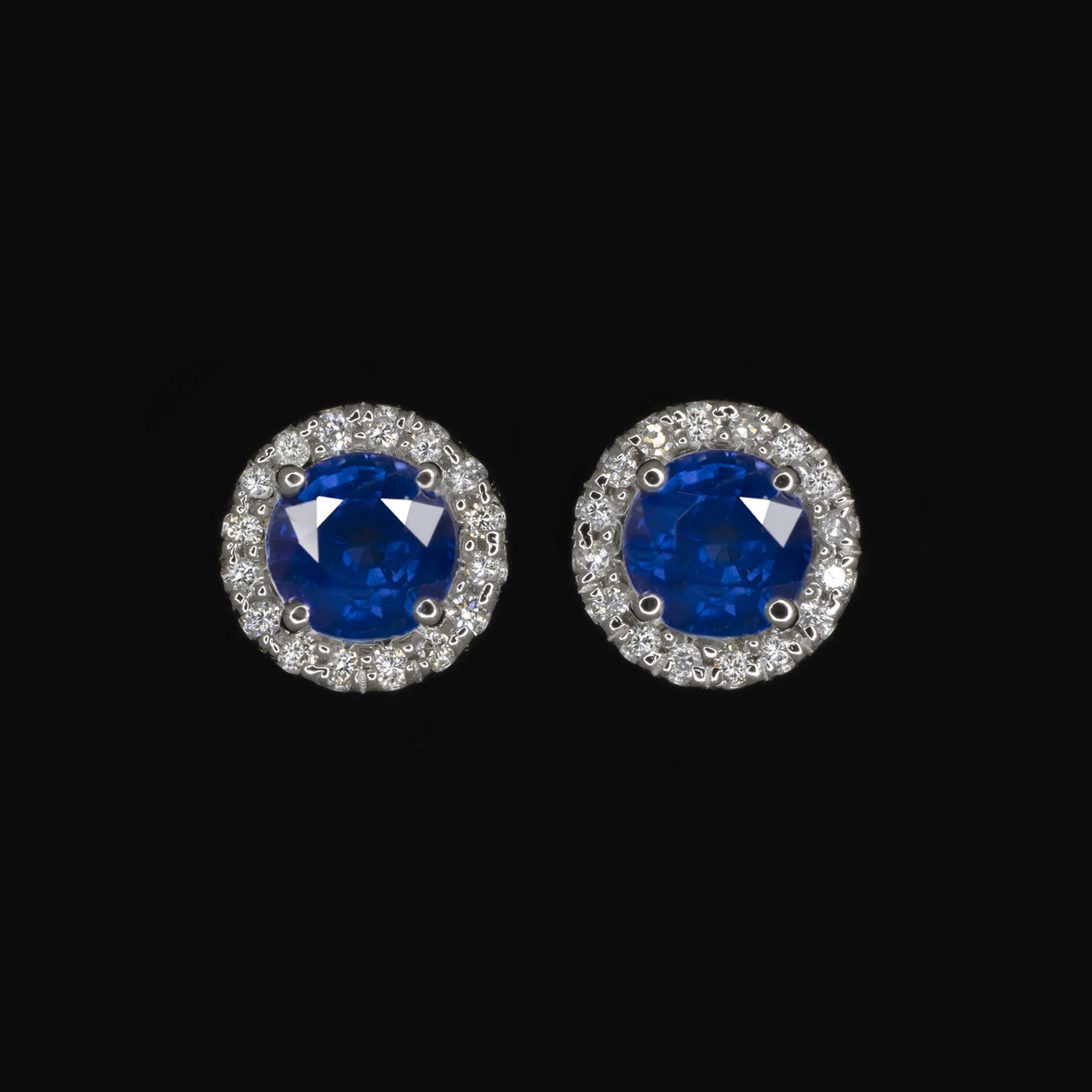 These elegant stud earrings feature rich blue sapphires surrounded by halos of vibrant diamonds!