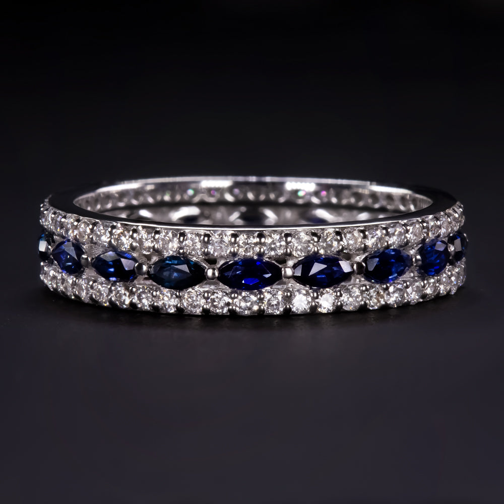 NATURAL SAPPHIRE DIAMOND WEDDING BAND ETERNITY RING 3 ROW MARQUISE WHITE GOLD