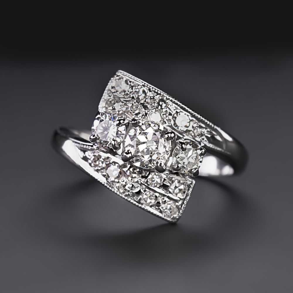This vintage diamond ring has a unique and elegant design with an old European cut diamond center, a diamond studded face, and a geometric bypass design.