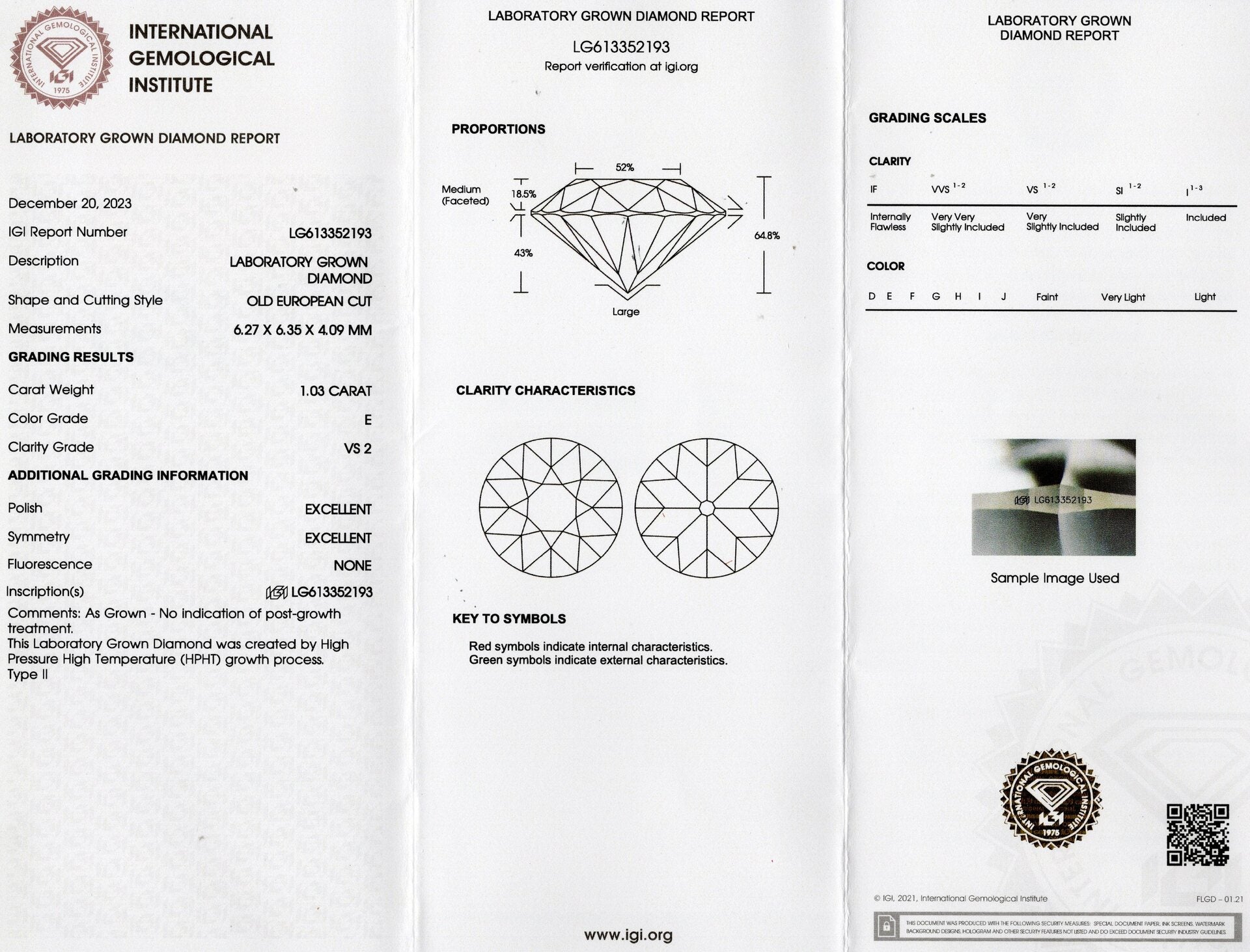 This unique Art Deco style ring features a vibrant old European cut lab grown diamond at the center of an angular sapphire halo!