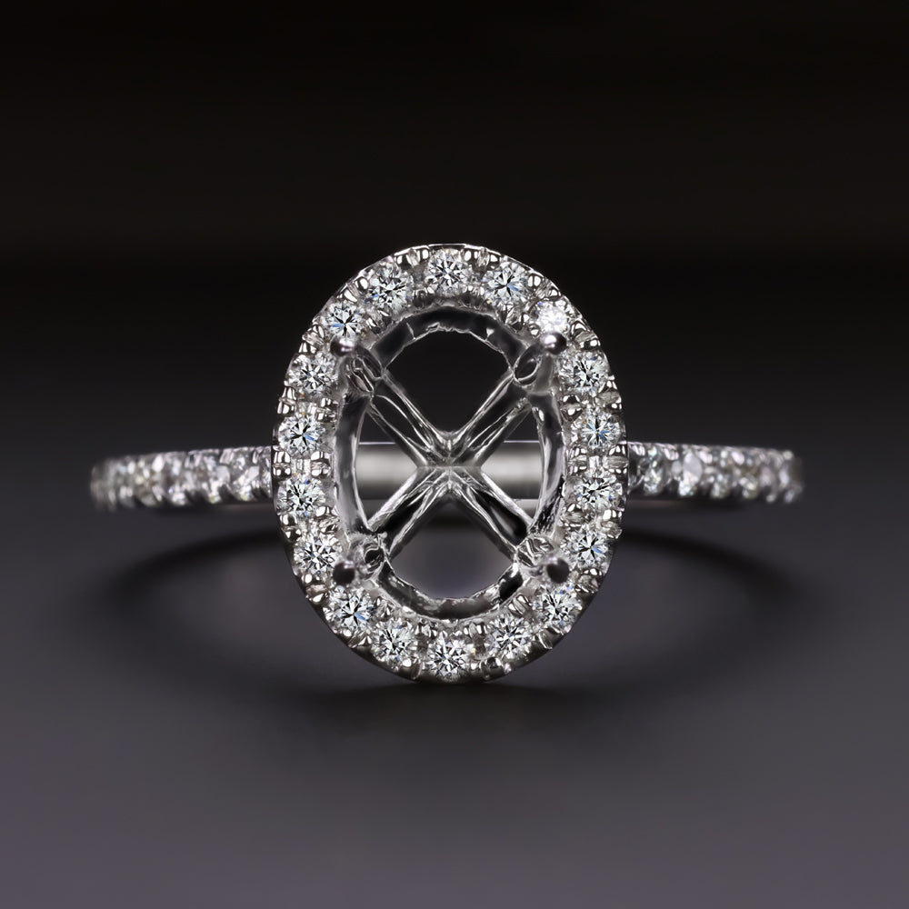 This ring setting features an oval setting surrounded by a glittering diamond halo.